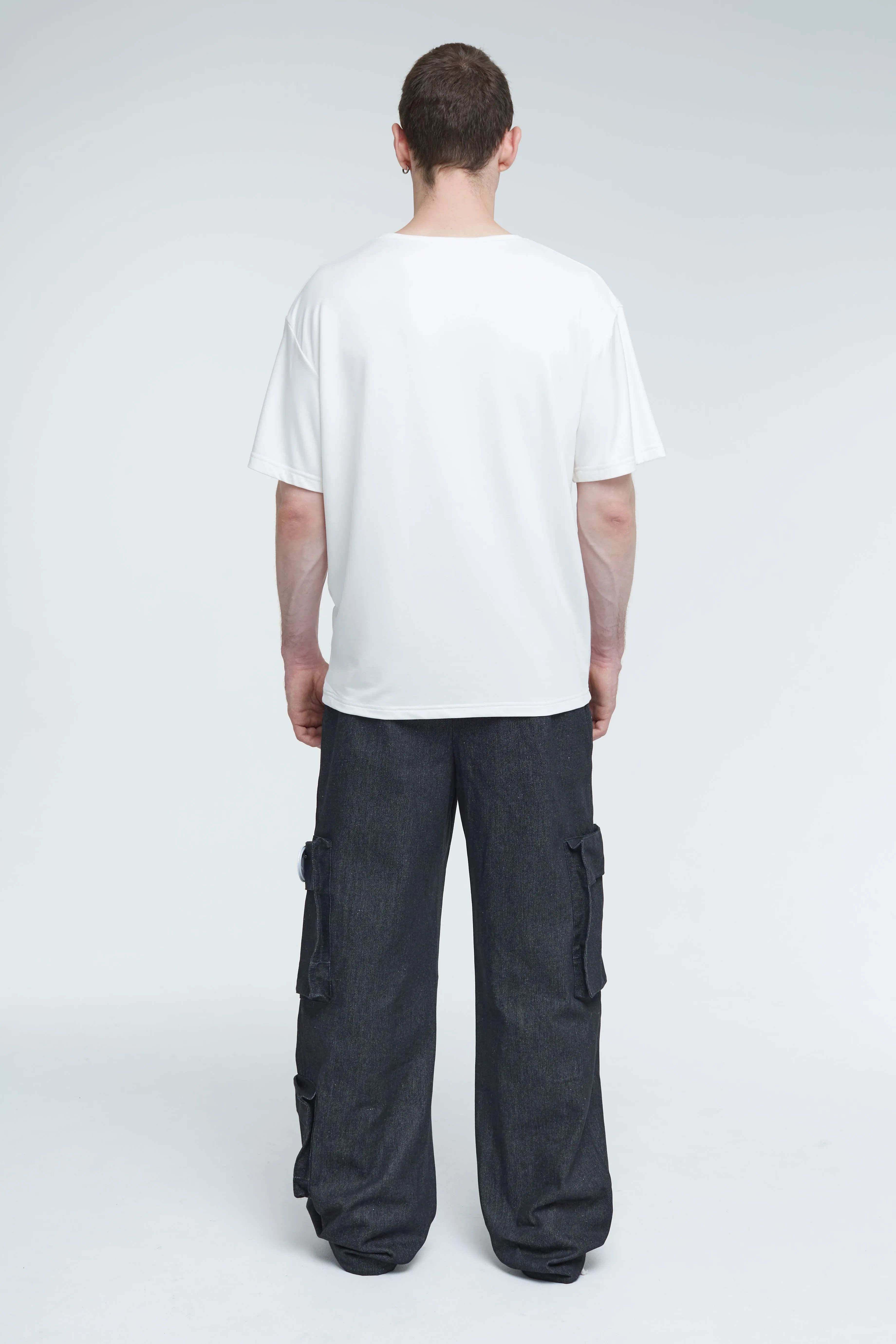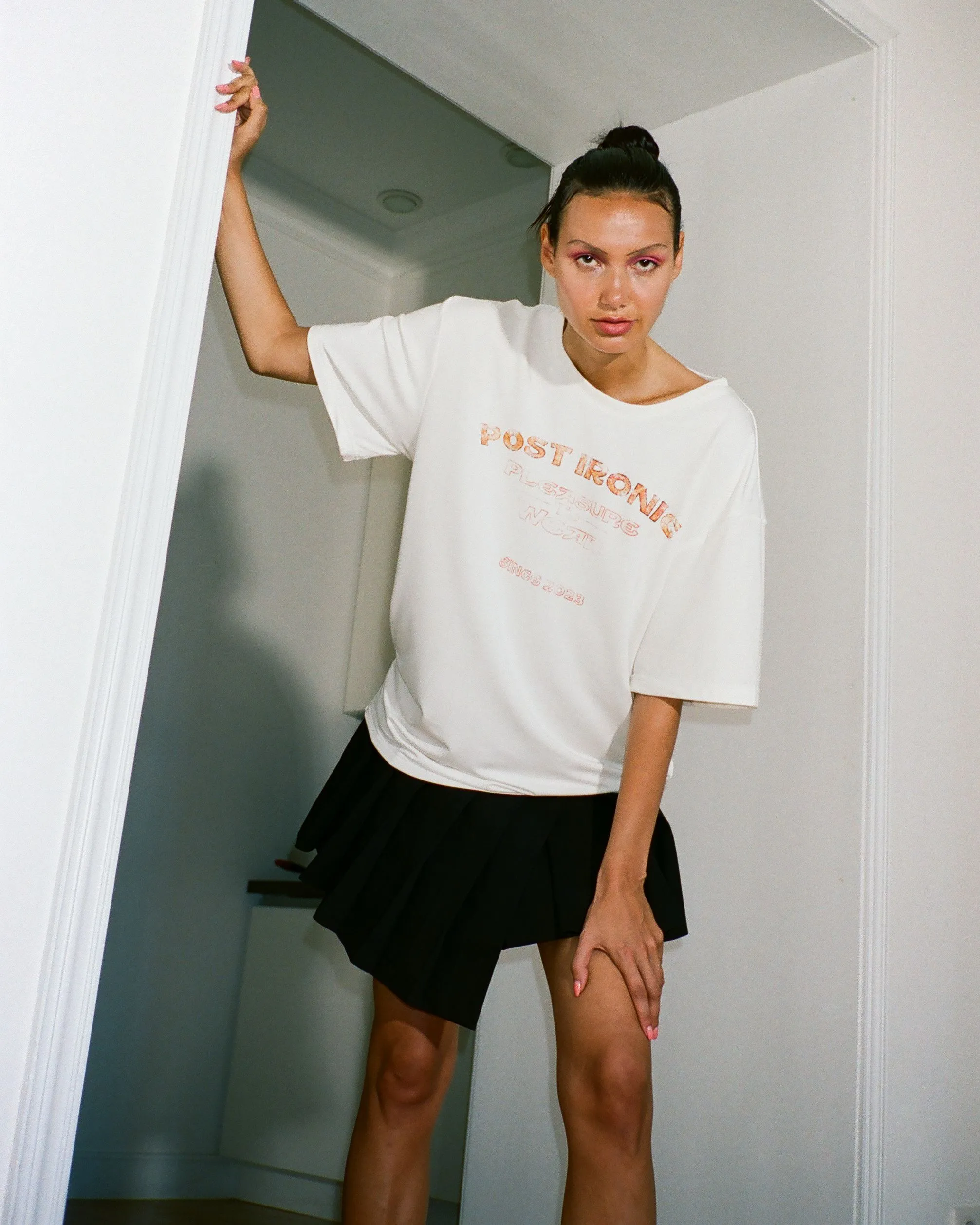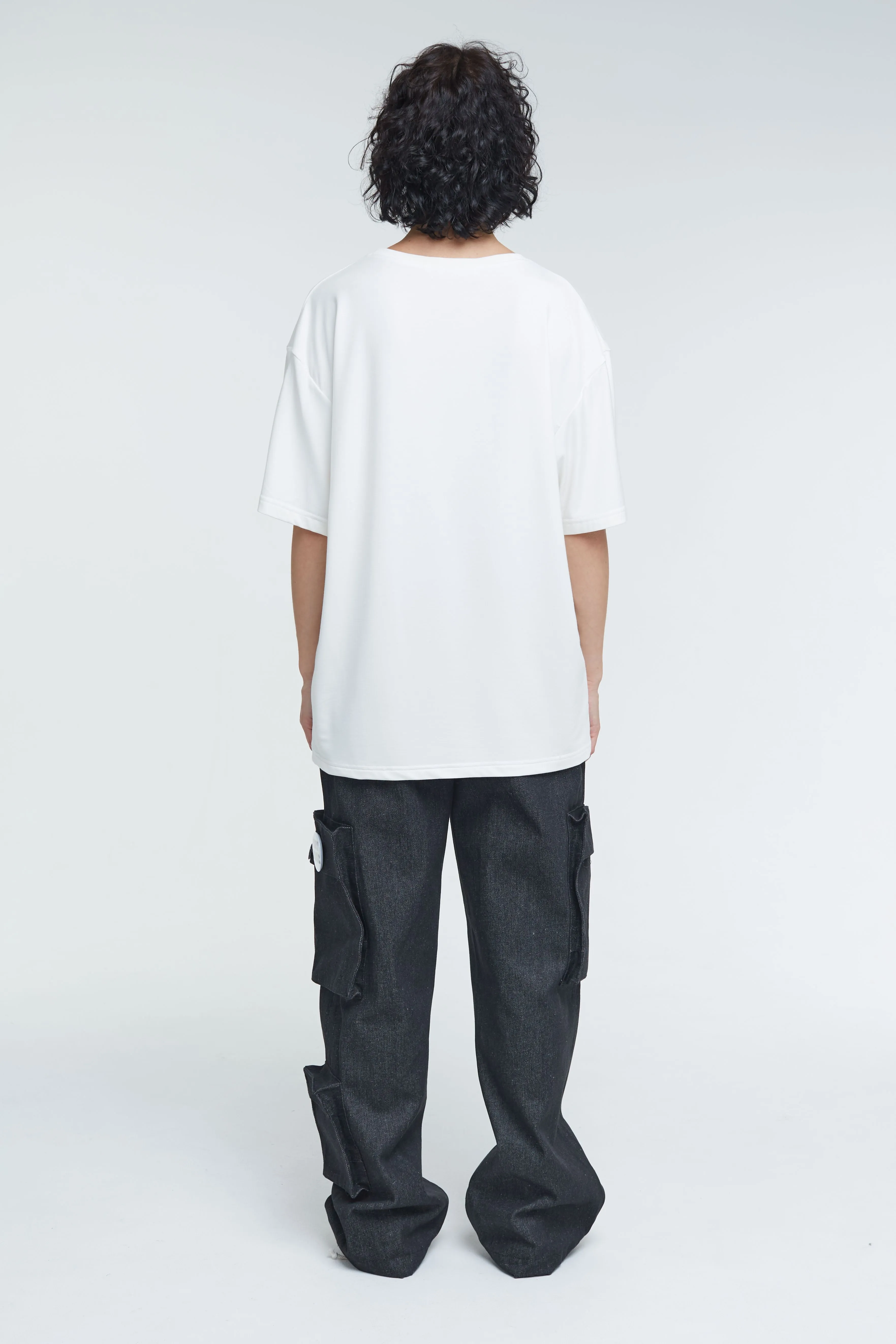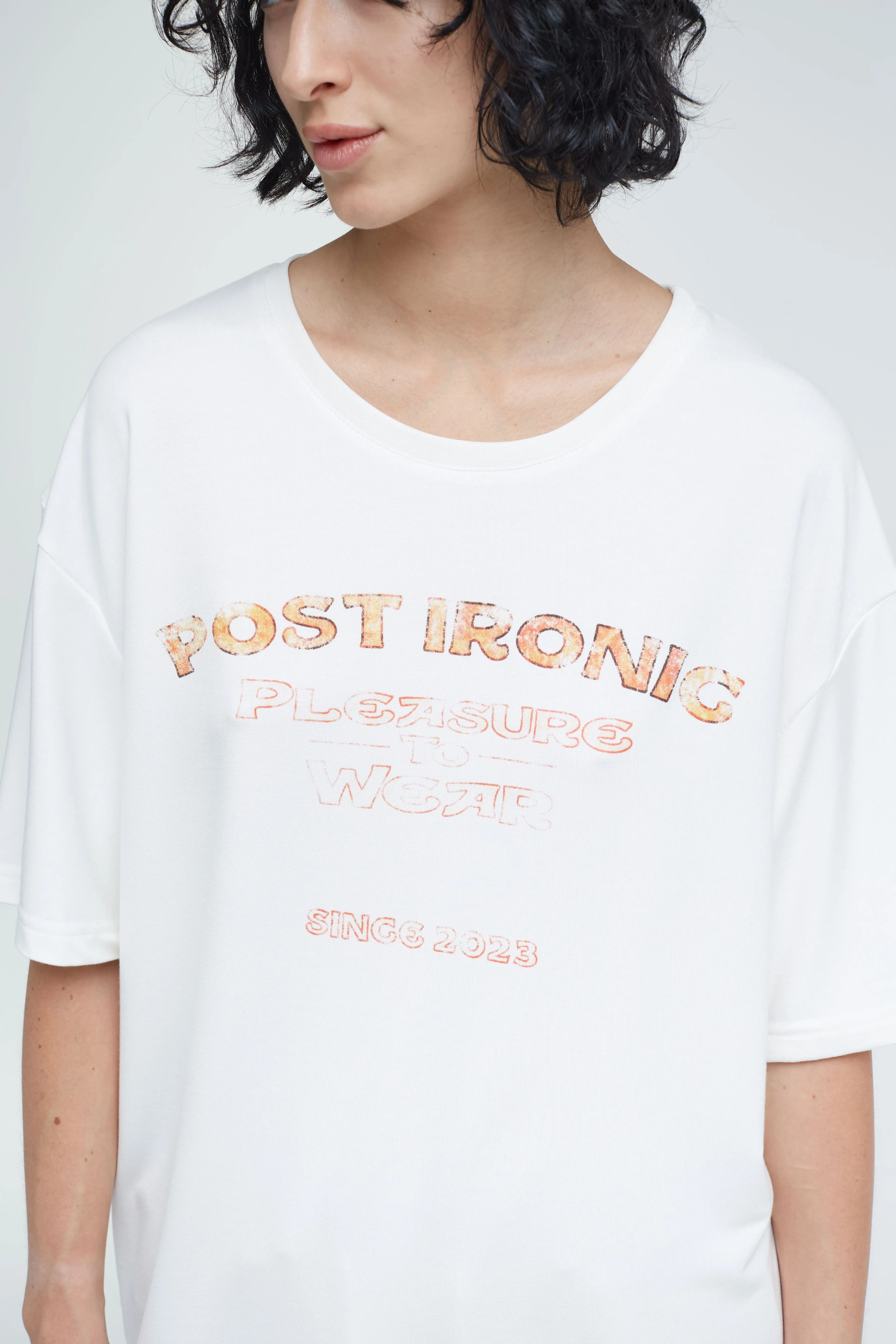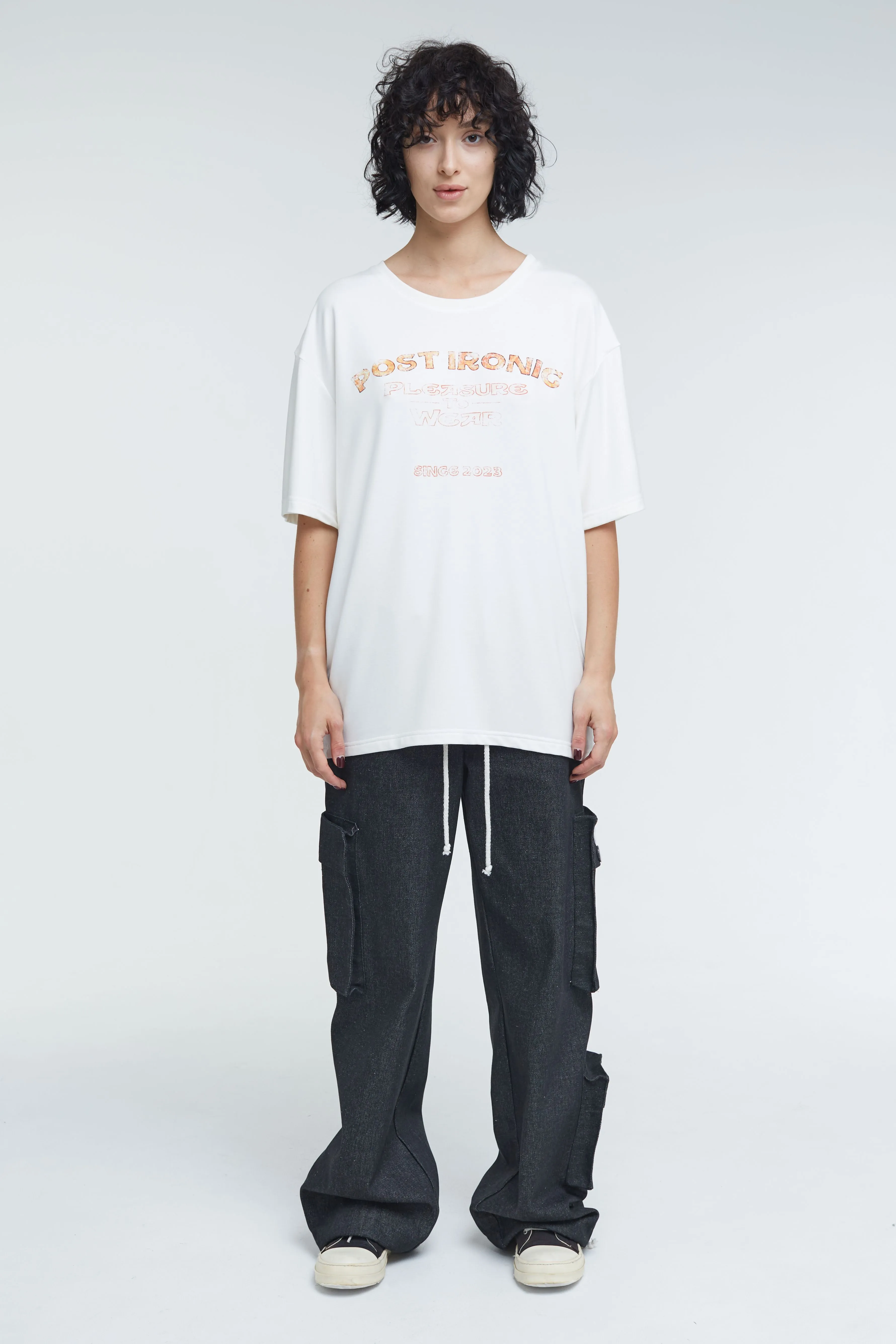 Футболка из тонкого джерси, полотно из которого получается особенно мягким и эластичным. Модель унисекс, свободного кроя, с круглым горловым вырезом и короткими рукавами. Изделие молочного цвета и прямого силуэта, принт на груди в виде логотипа бренда.
