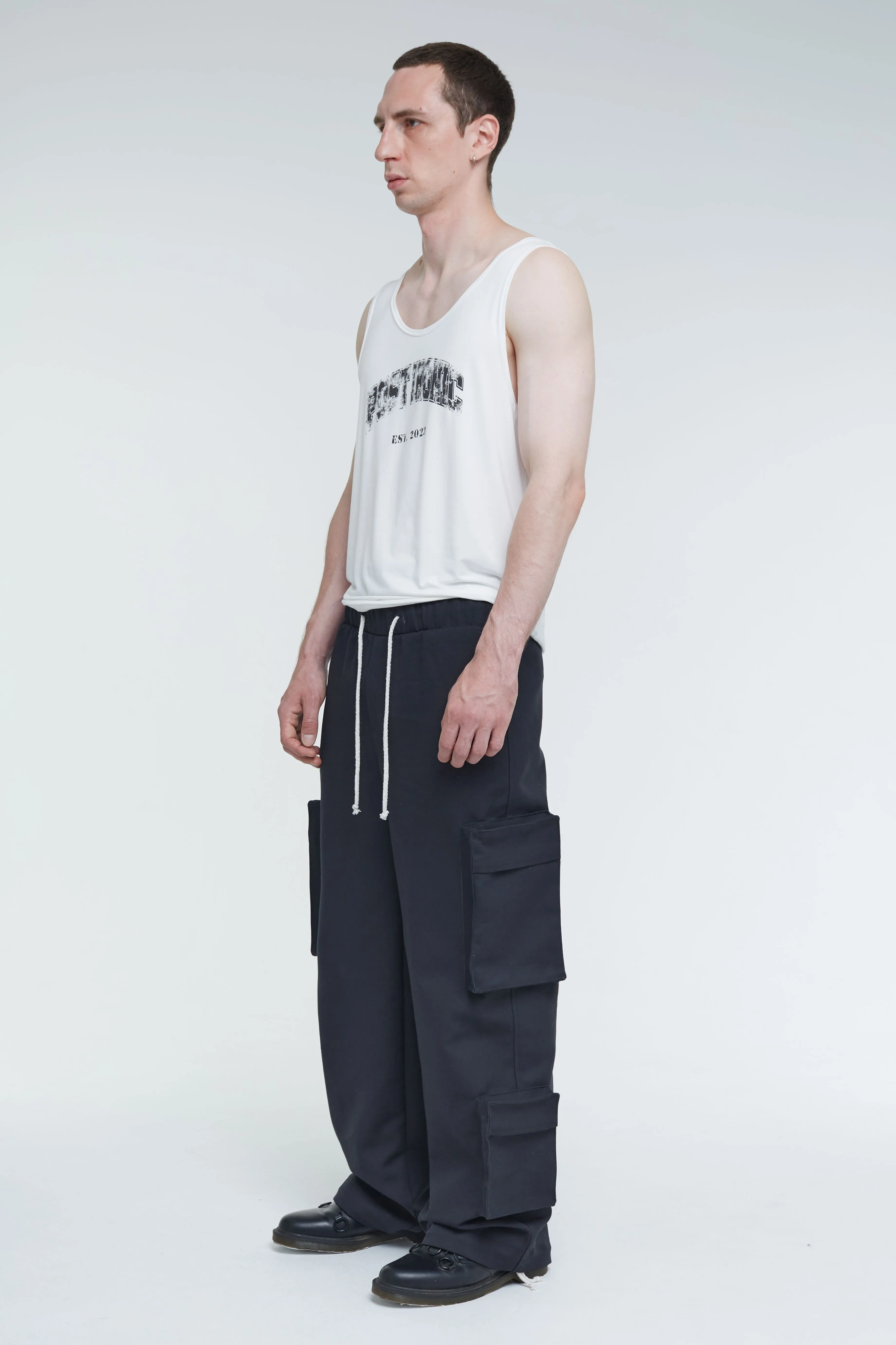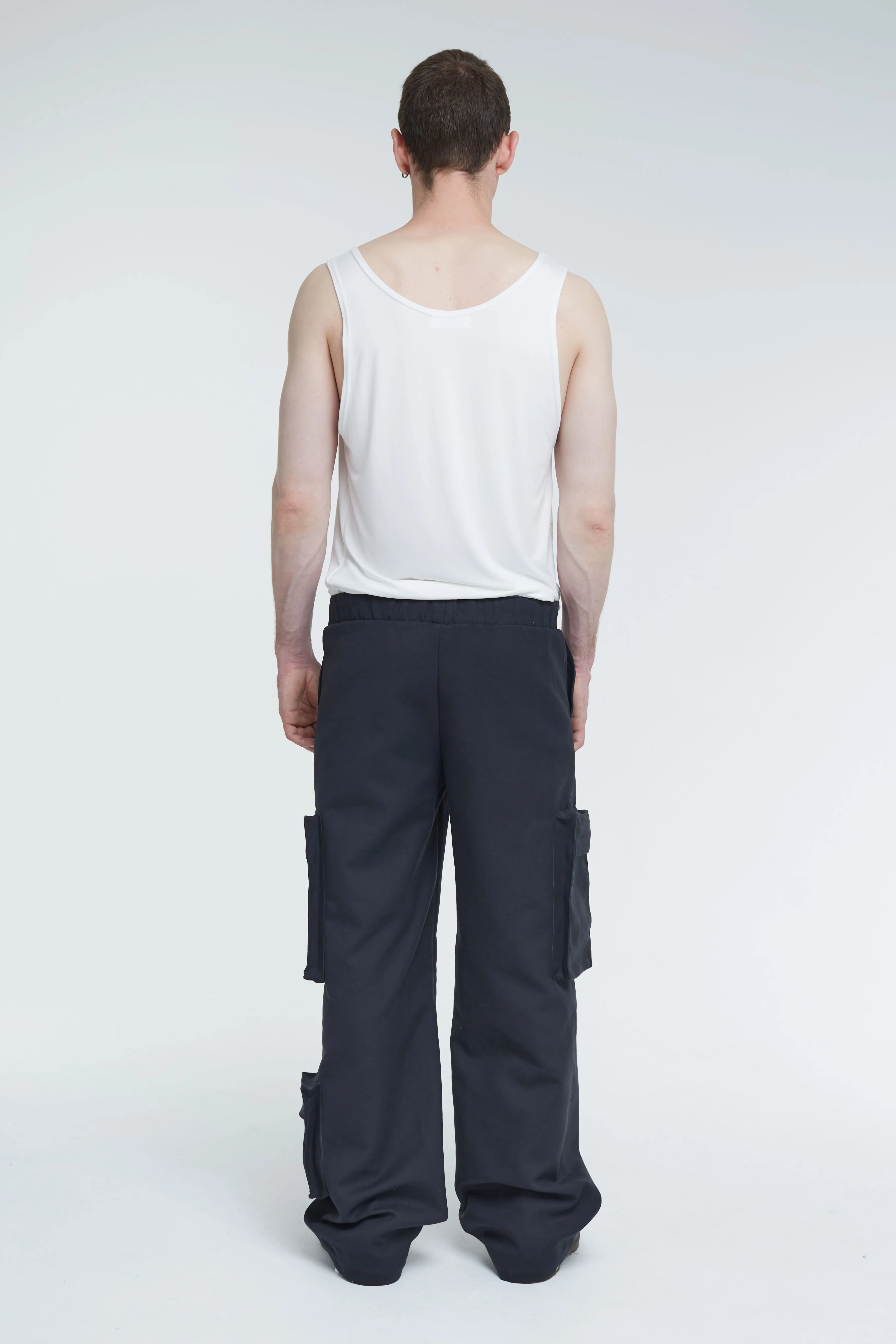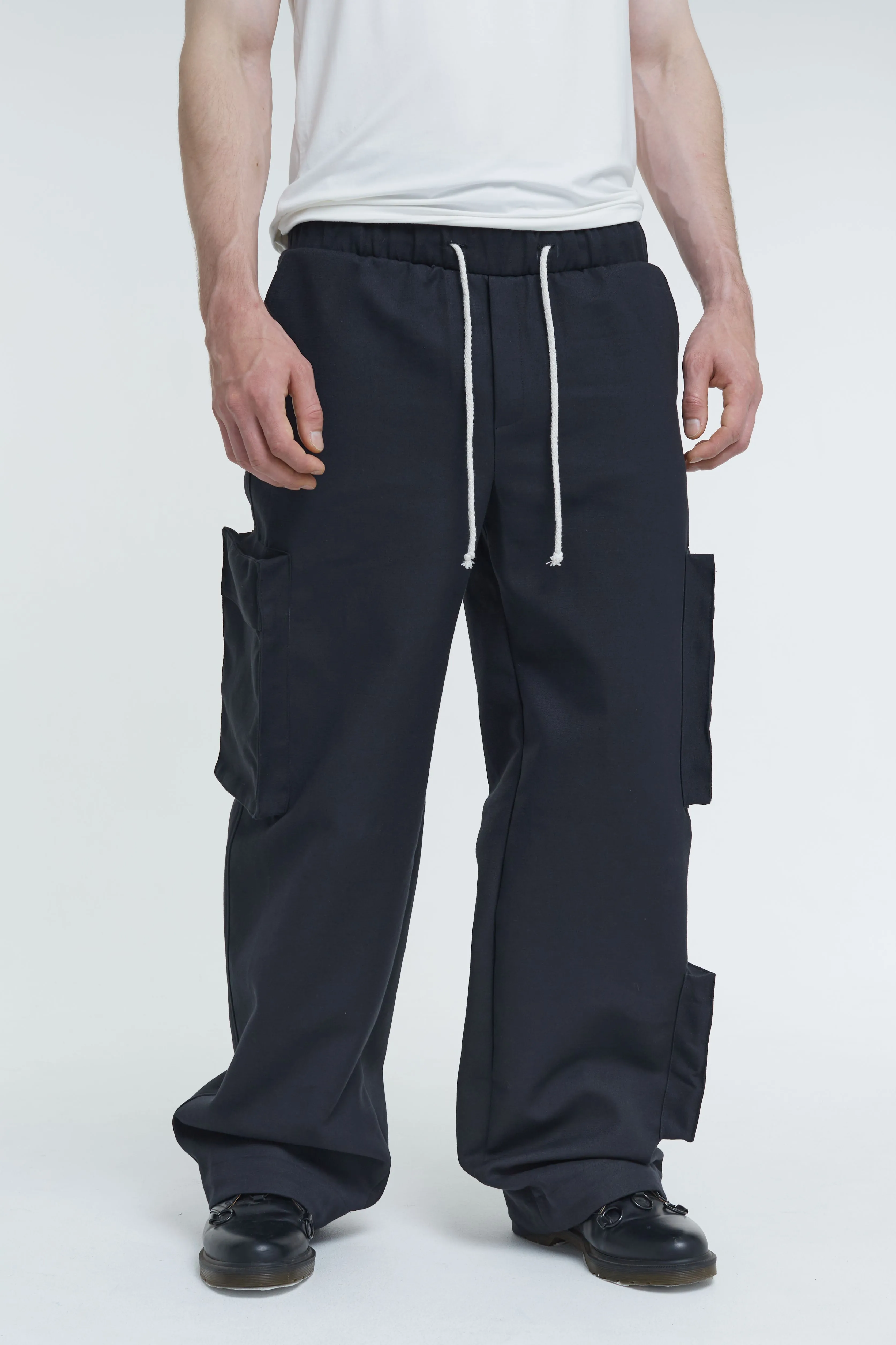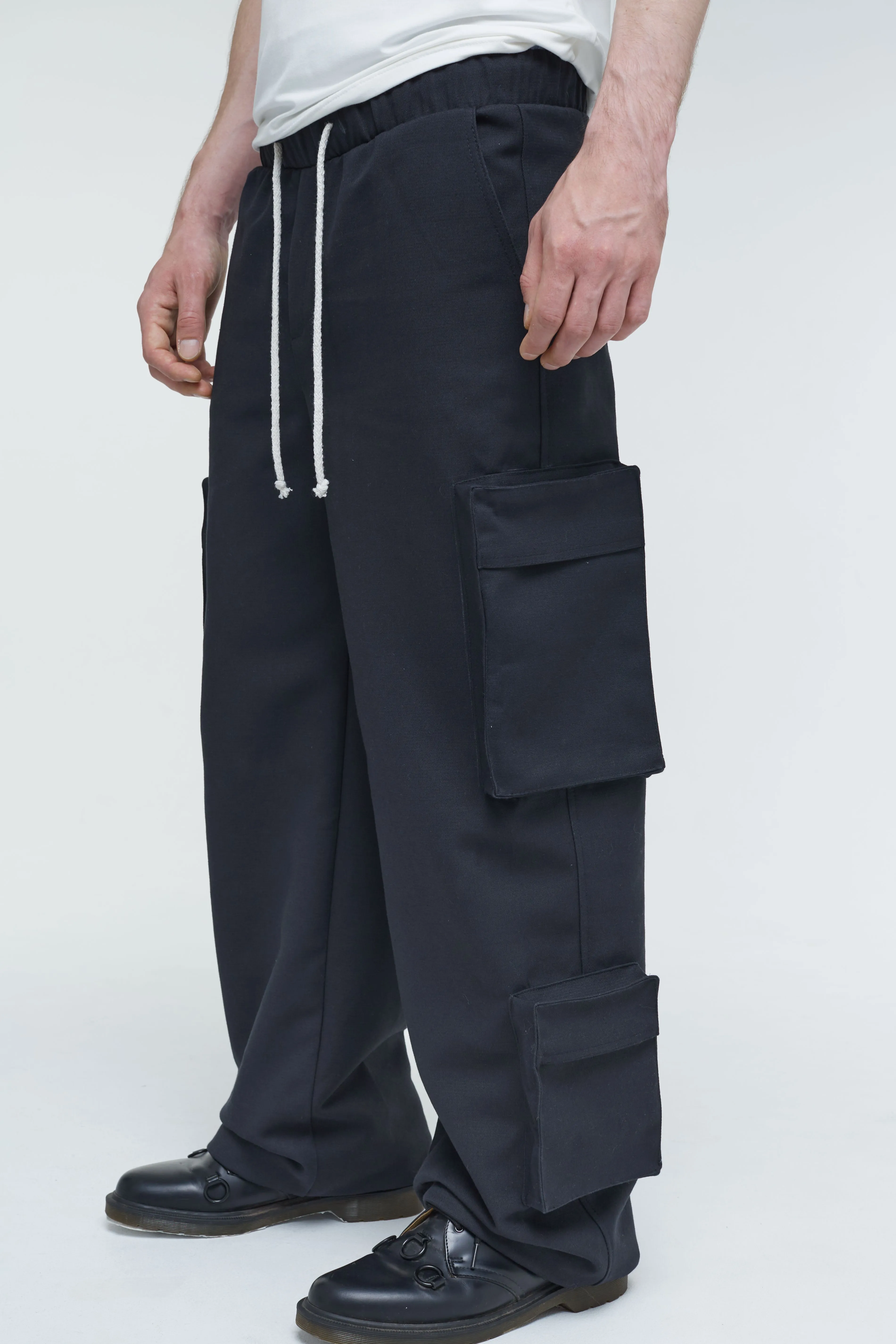 Джинсовые брюки-карго. Модель свободного кроя, из прочного темно-серого хлопка с особенно плотным переплетением волокон. Три крупных накладных кармана дополнены крупными значками с логотипом бренда. Манжеты с длинными шнурами, позволяющими затянуть брючины снизу.