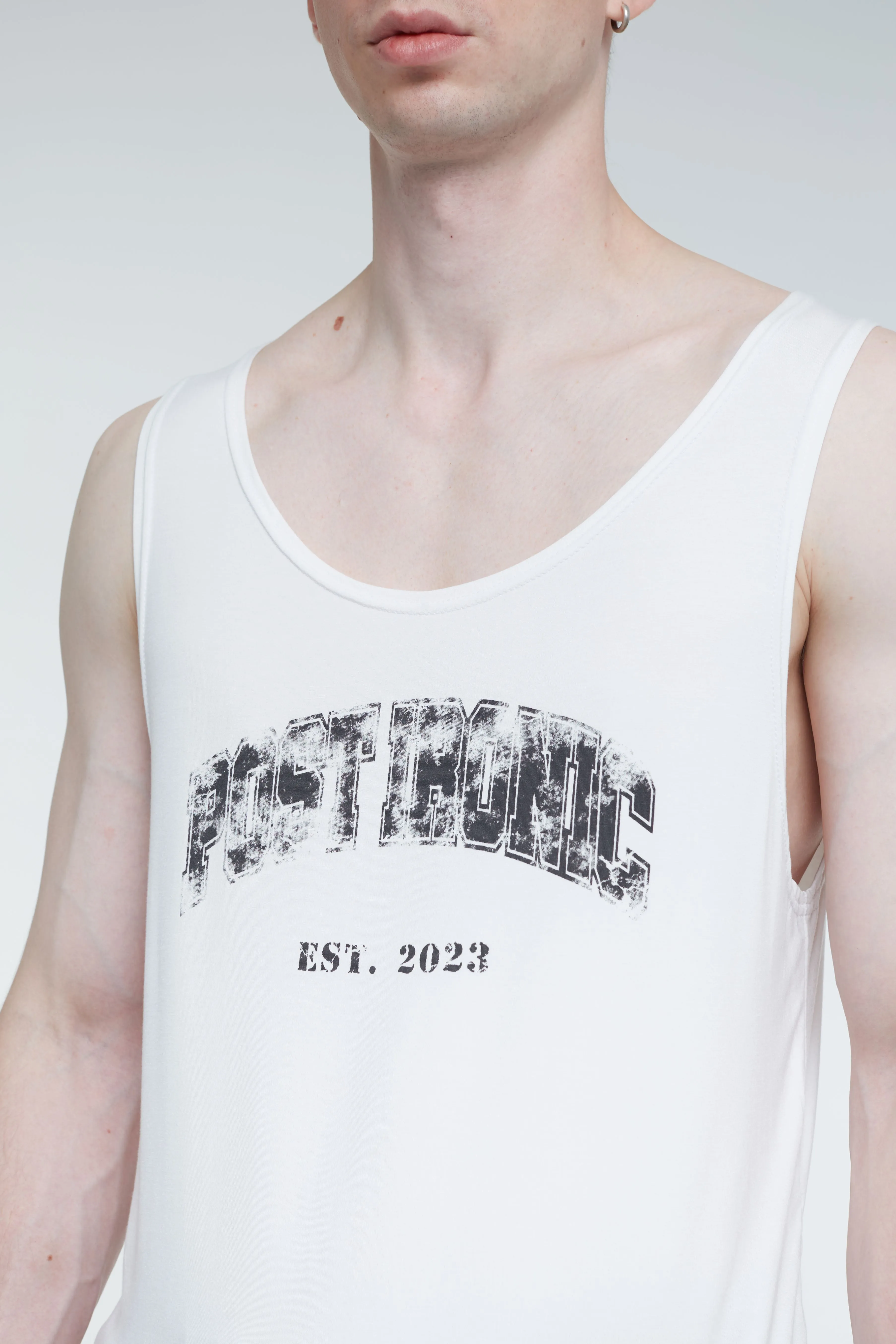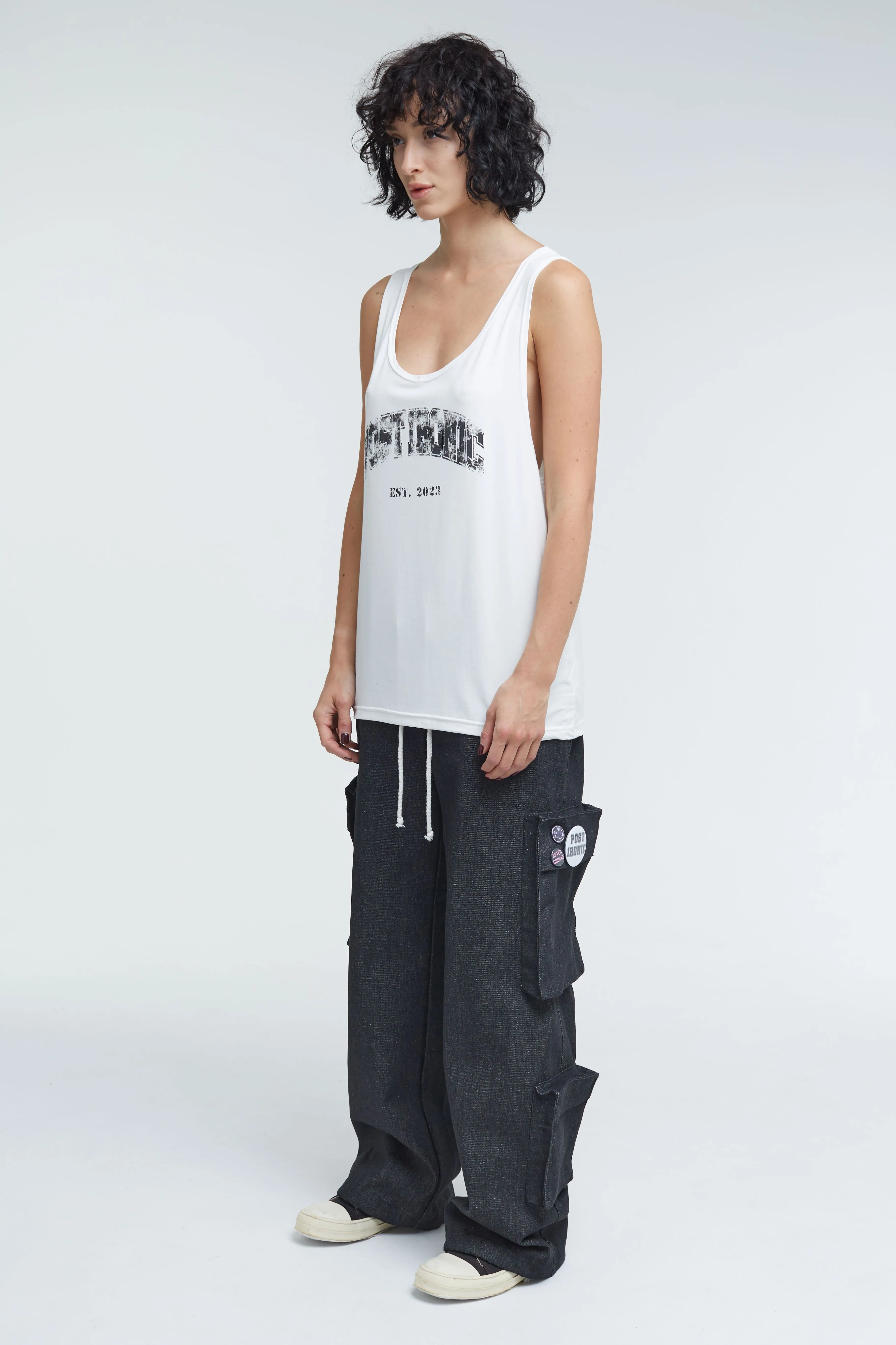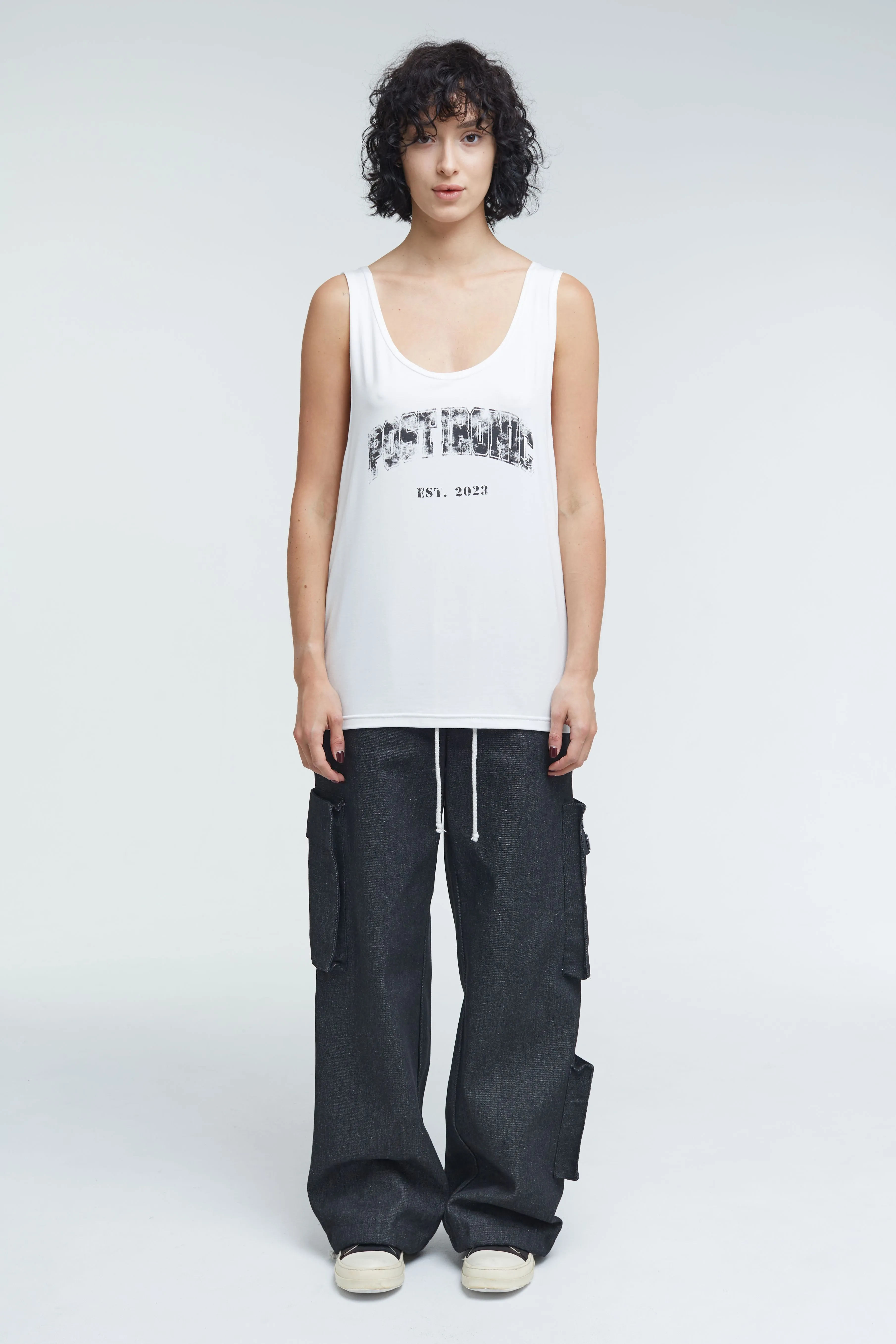 Майка из эластичного тонкого хлопка. Модель унисекс, свободного кроя, из мягкого материала молочного цвета. Крупный принт на груди в виде логотипа бренда.