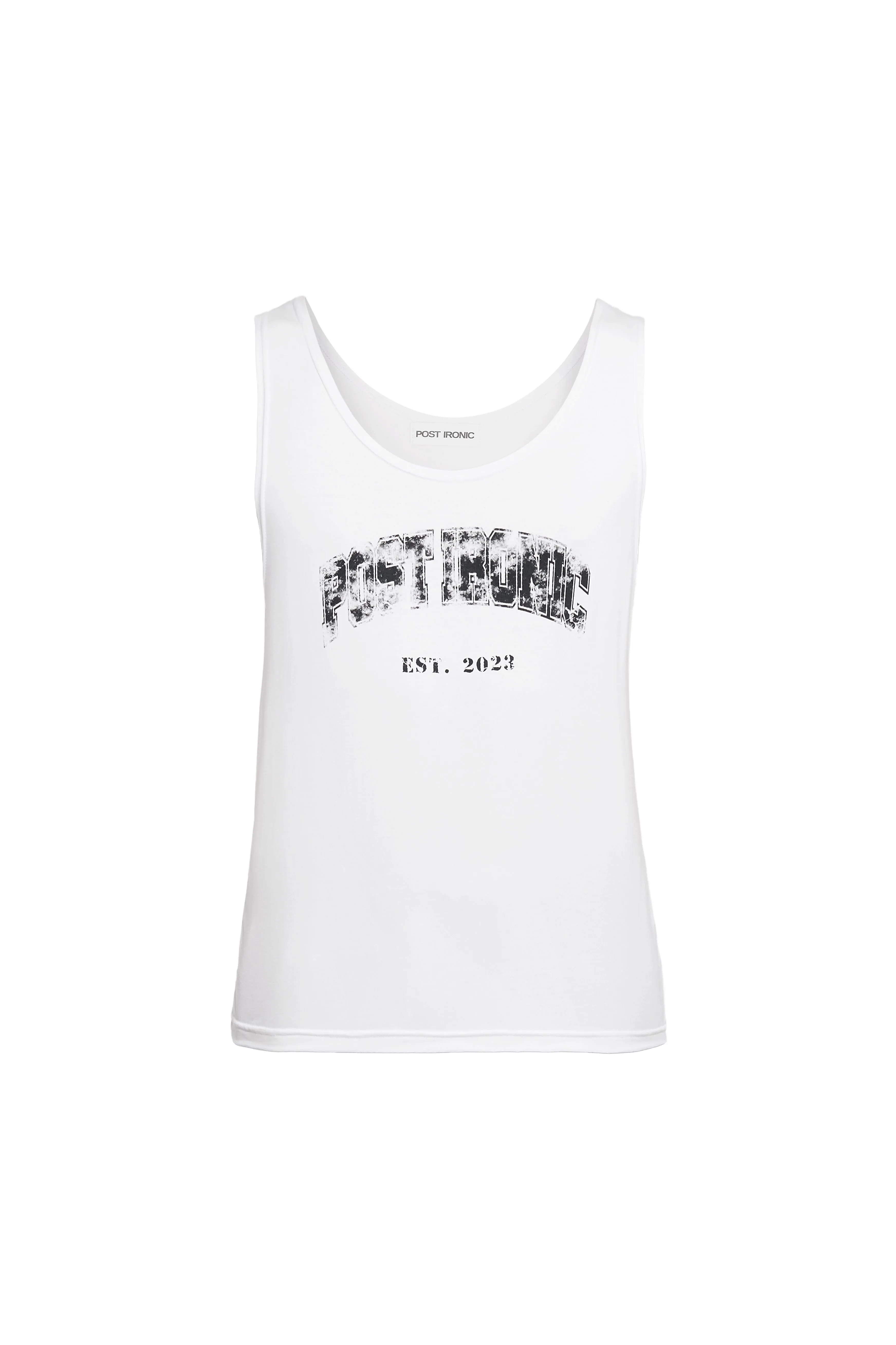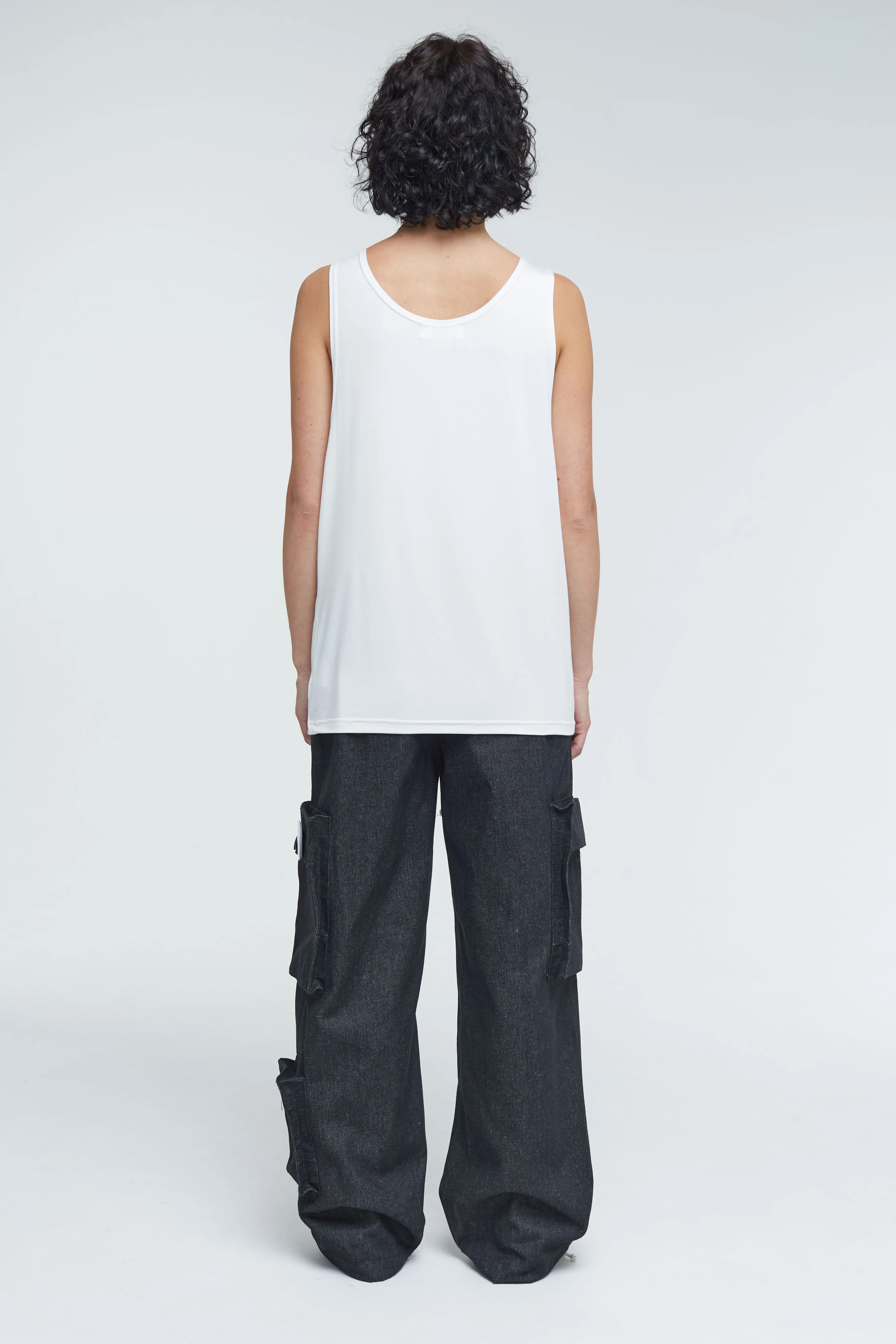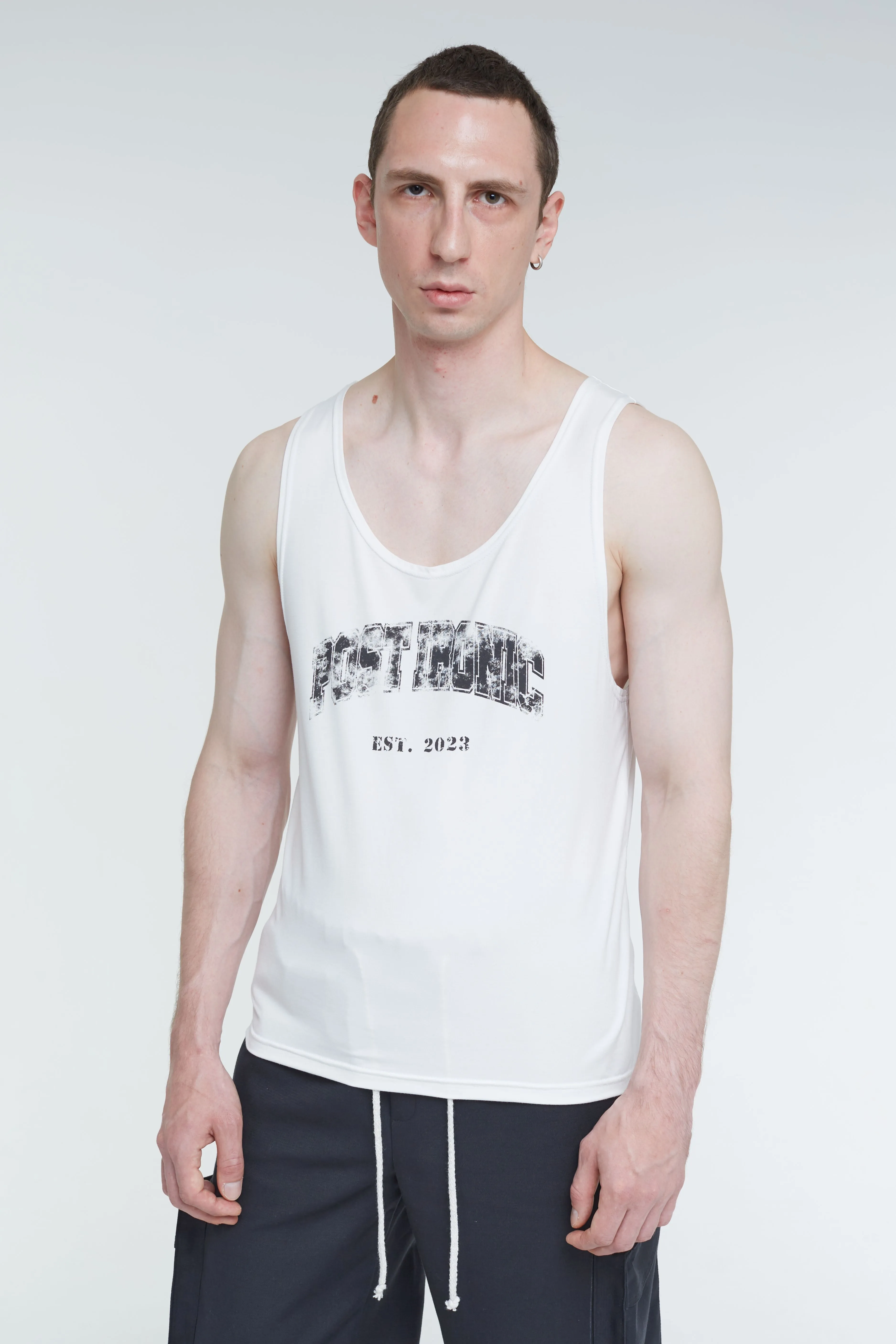 Майка из эластичного тонкого хлопка. Модель унисекс, свободного кроя, из мягкого материала молочного цвета. Крупный принт на груди в виде логотипа бренда.