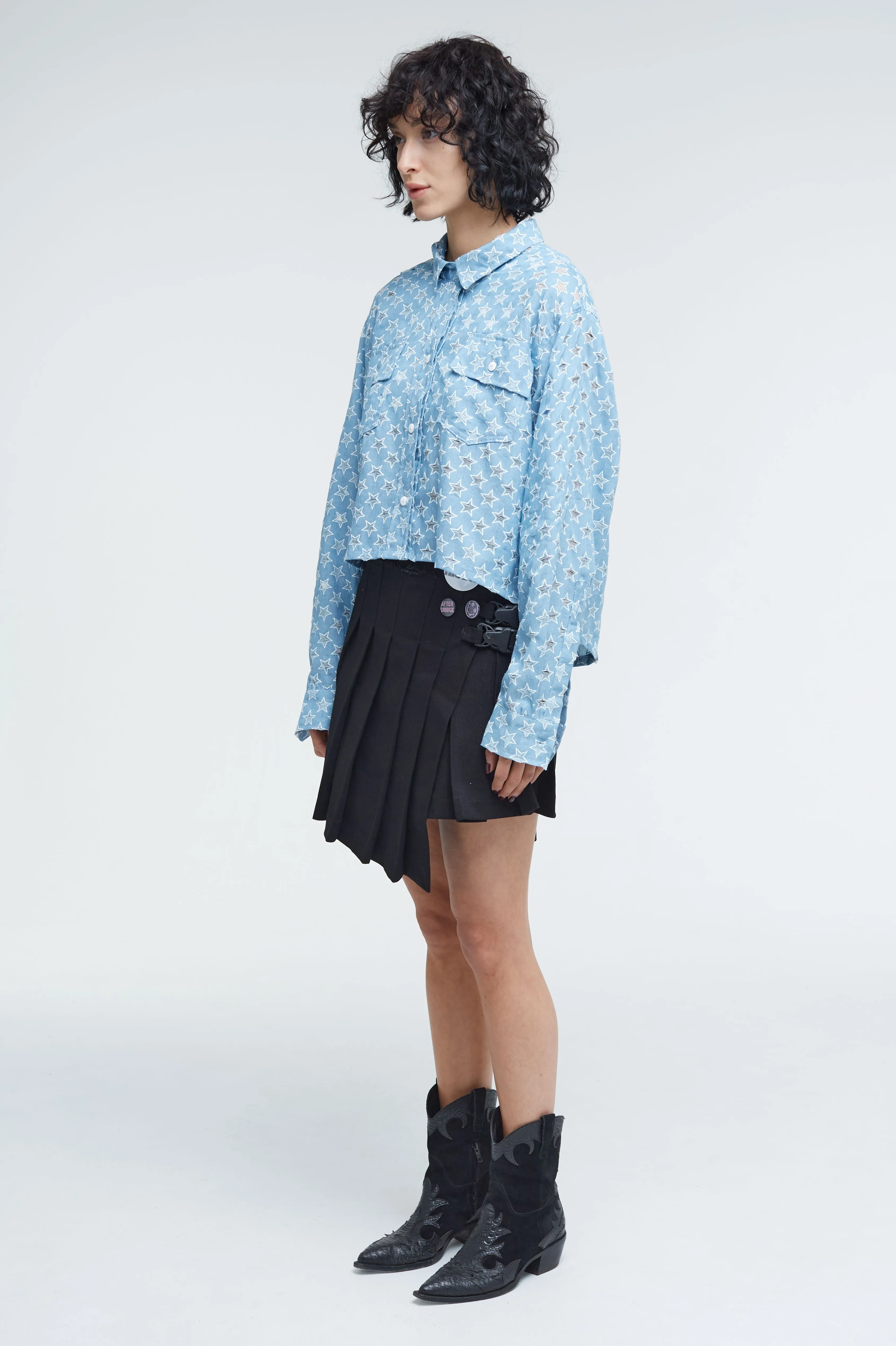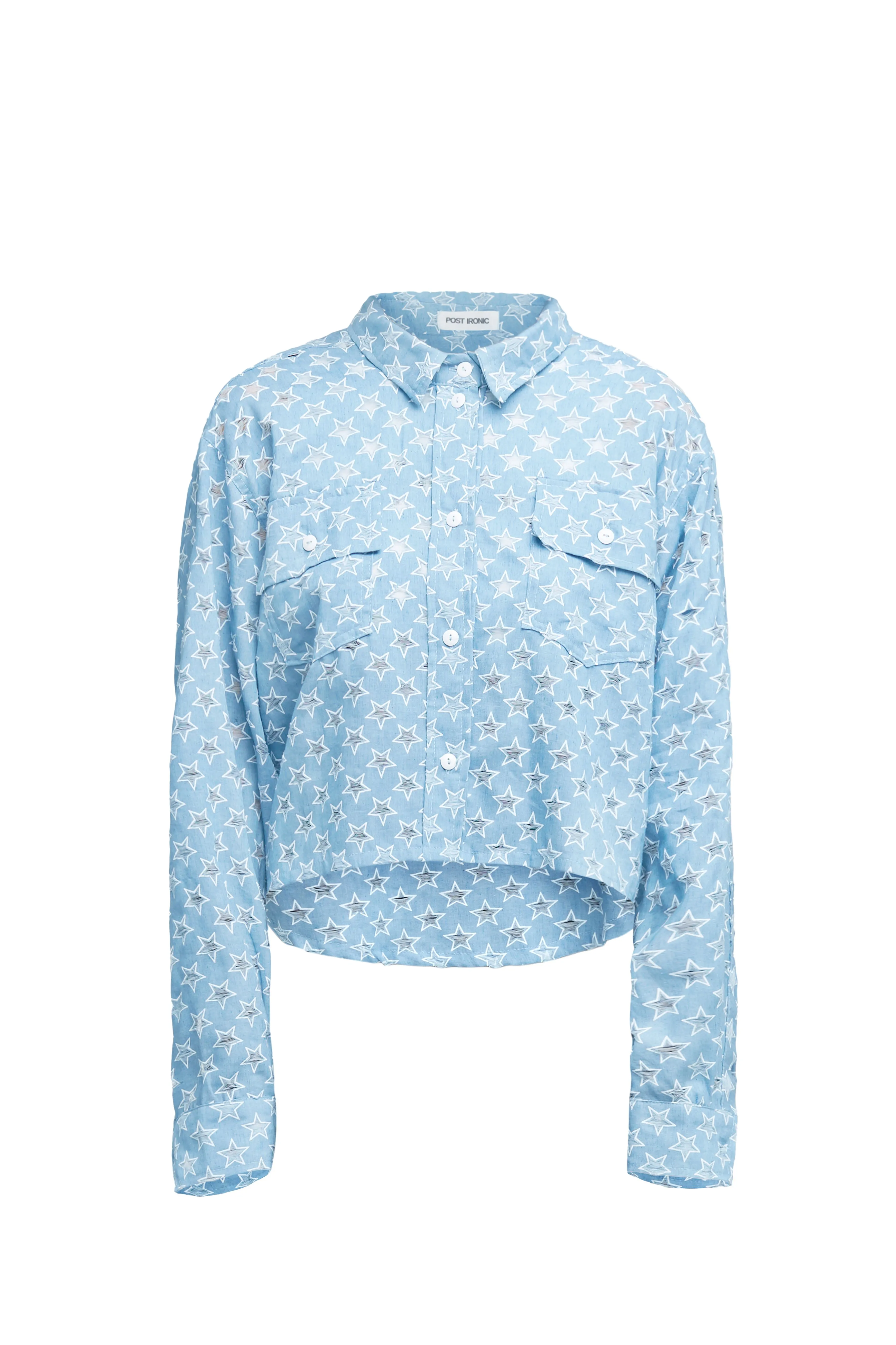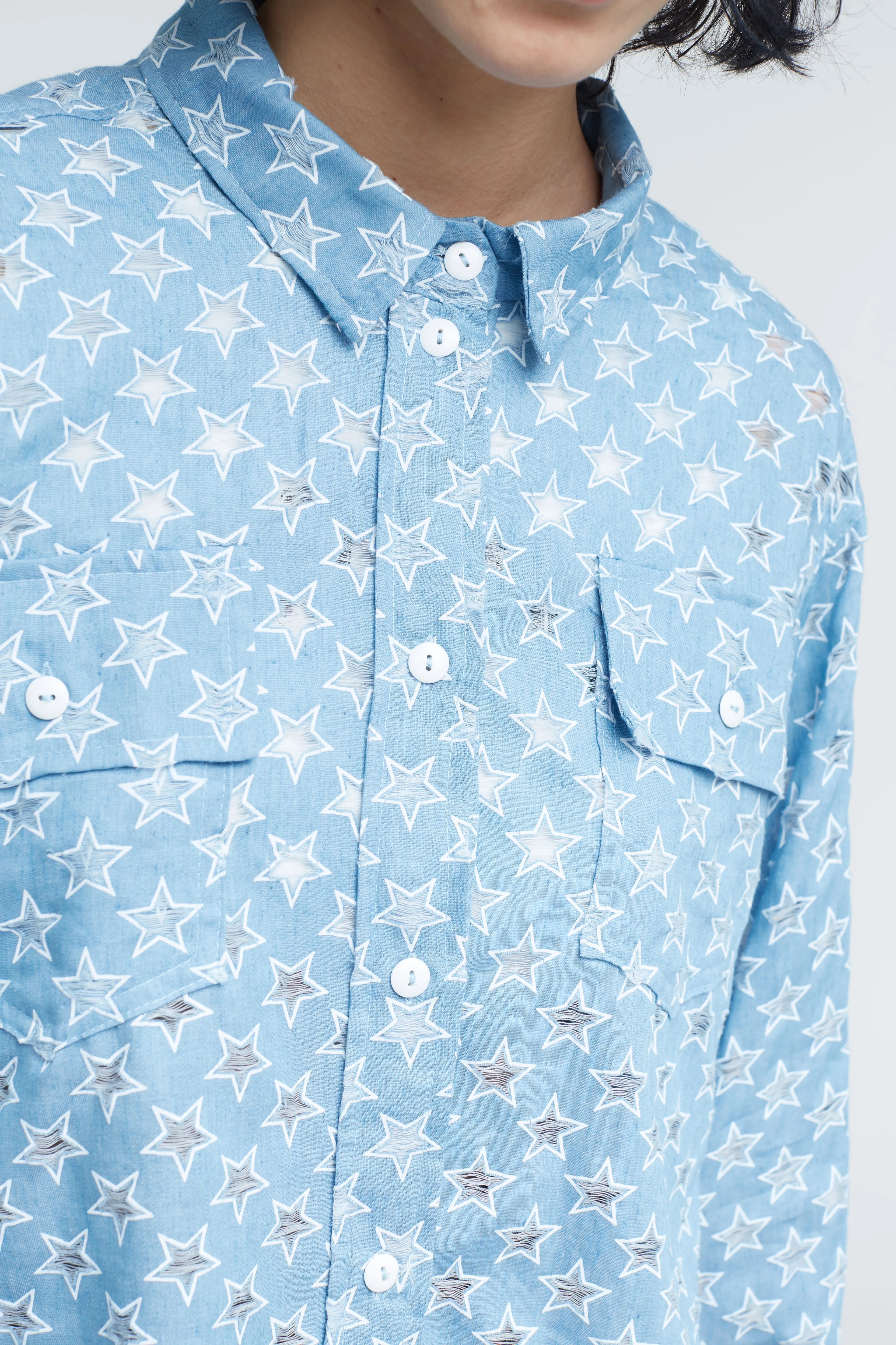 Рубашка из тонкого голубого хлопка со звездами. Укороченный свободный крой, подчеркнутый крупными накладными карманами. Модель со спущенной линией плеч и немного удлиненными рукавами.