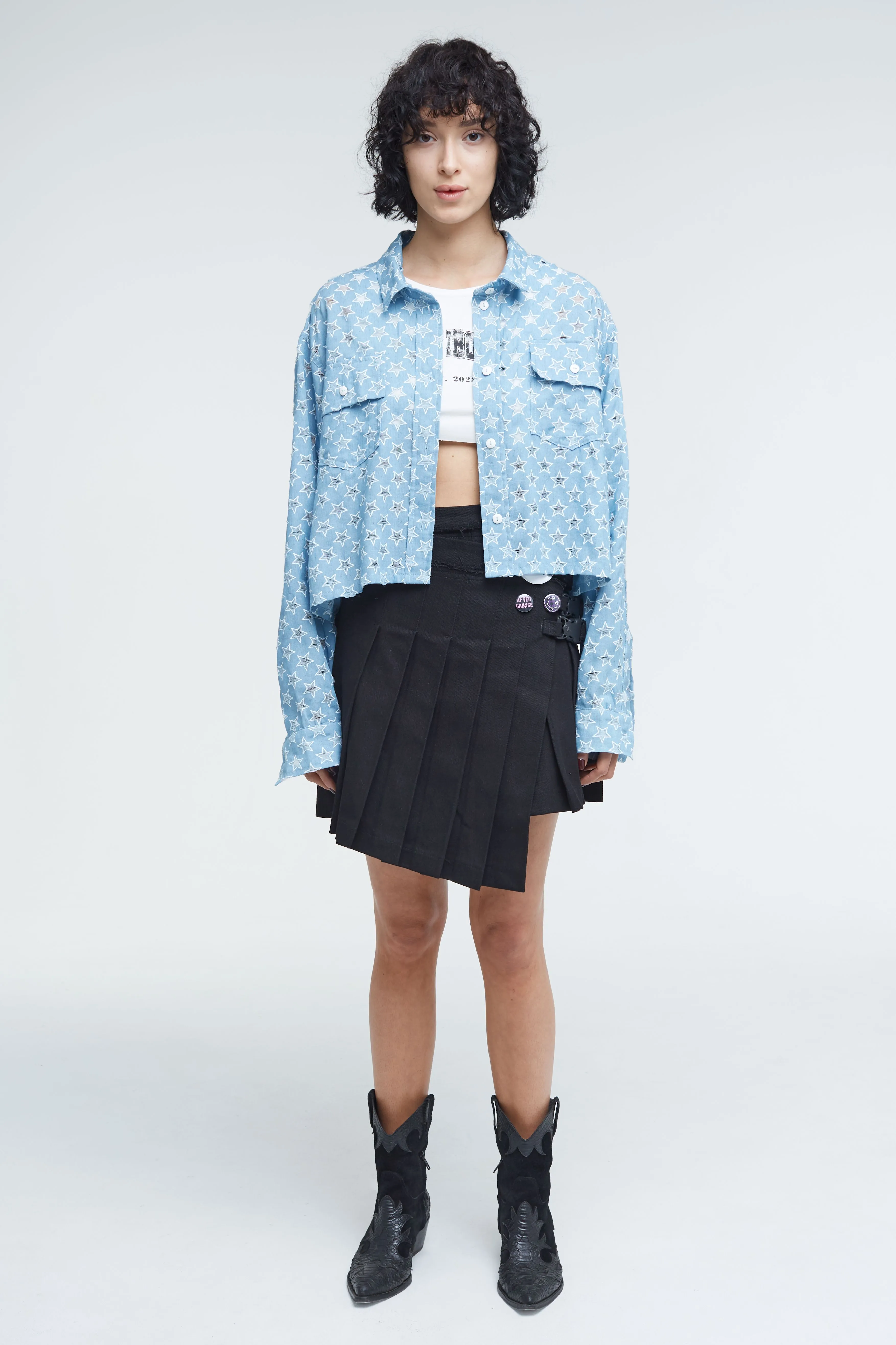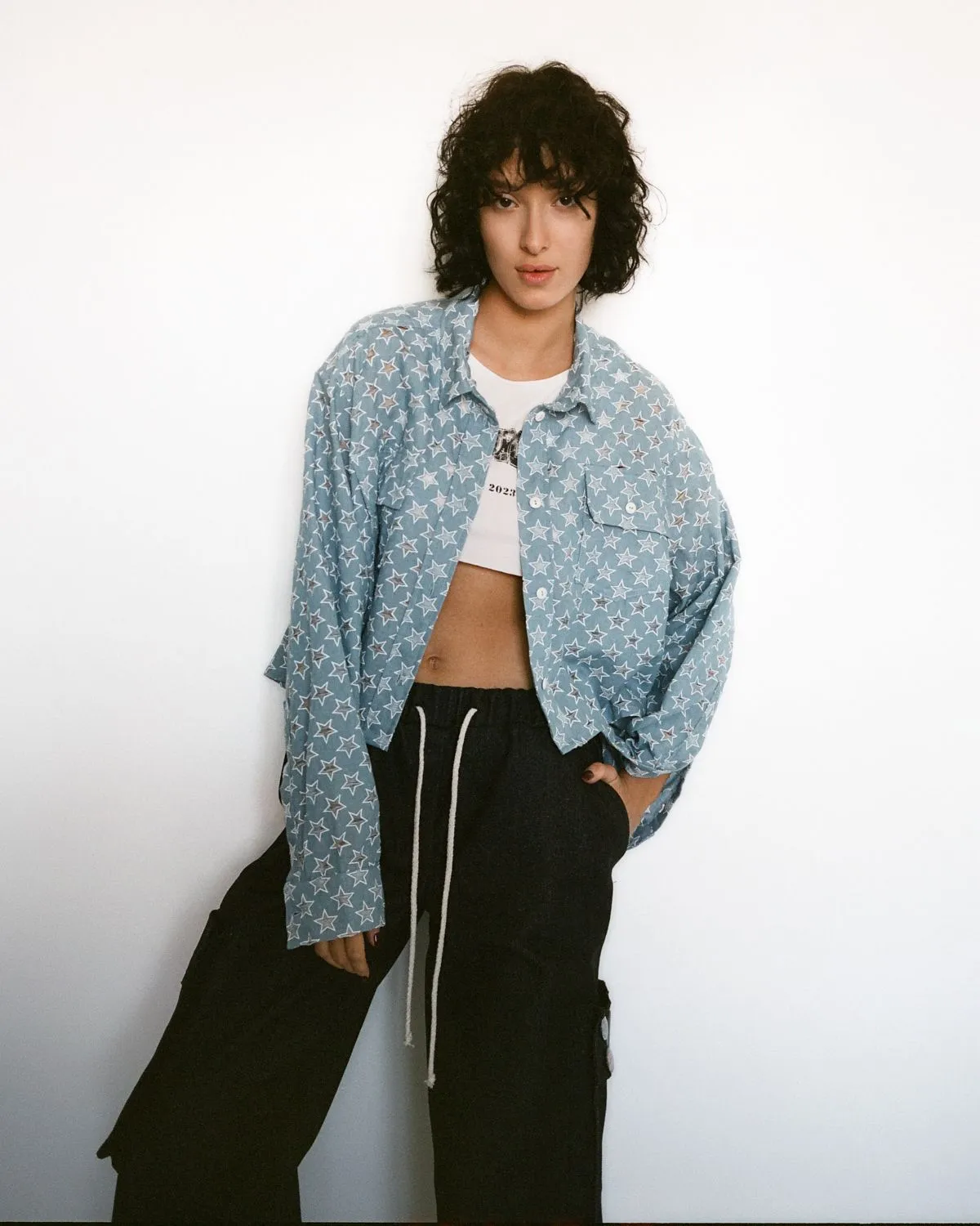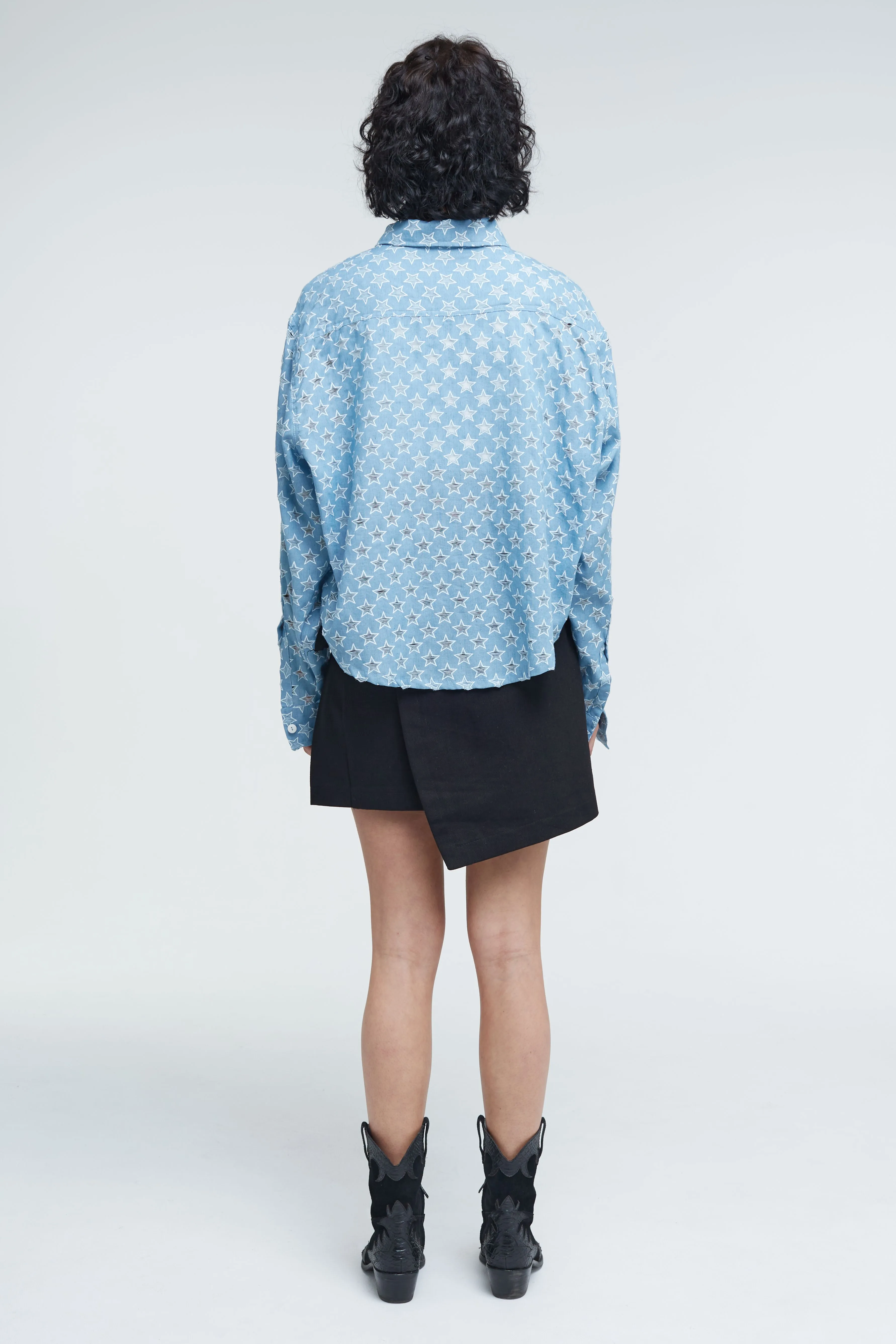 Рубашка из тонкого голубого хлопка со звездами. Укороченный свободный крой, подчеркнутый крупными накладными карманами. Модель со спущенной линией плеч и немного удлиненными рукавами.