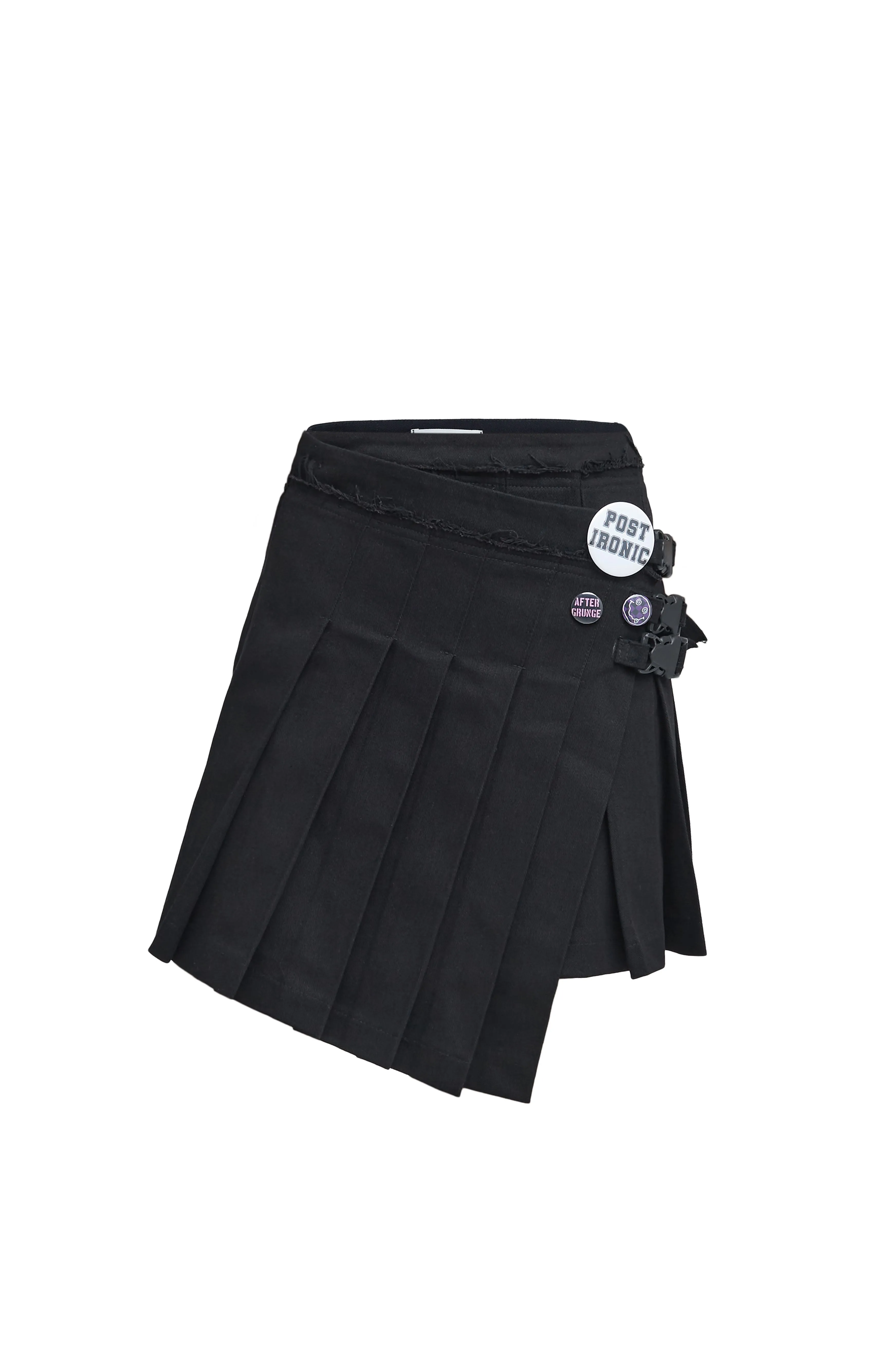 Асимметричная джинсовая мини-юбка. Модель выполнена из плотного черного хлопка и дополнена яркими значками. Необработанные края создают слегка небрежный тон, крупные складки формируют силуэт. На изделии предусмотрено три ремешка с возможностью регулировки посадки и размера.
