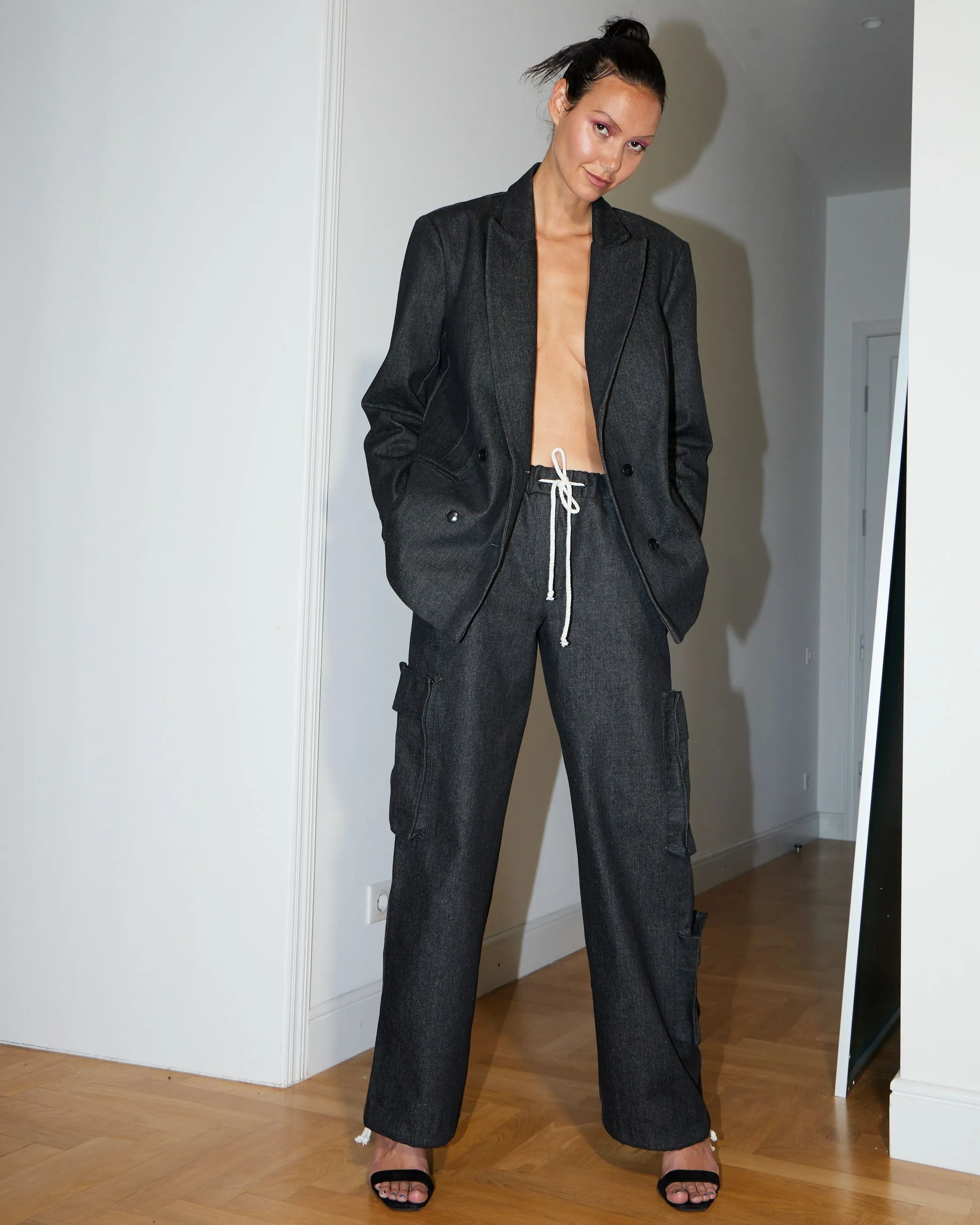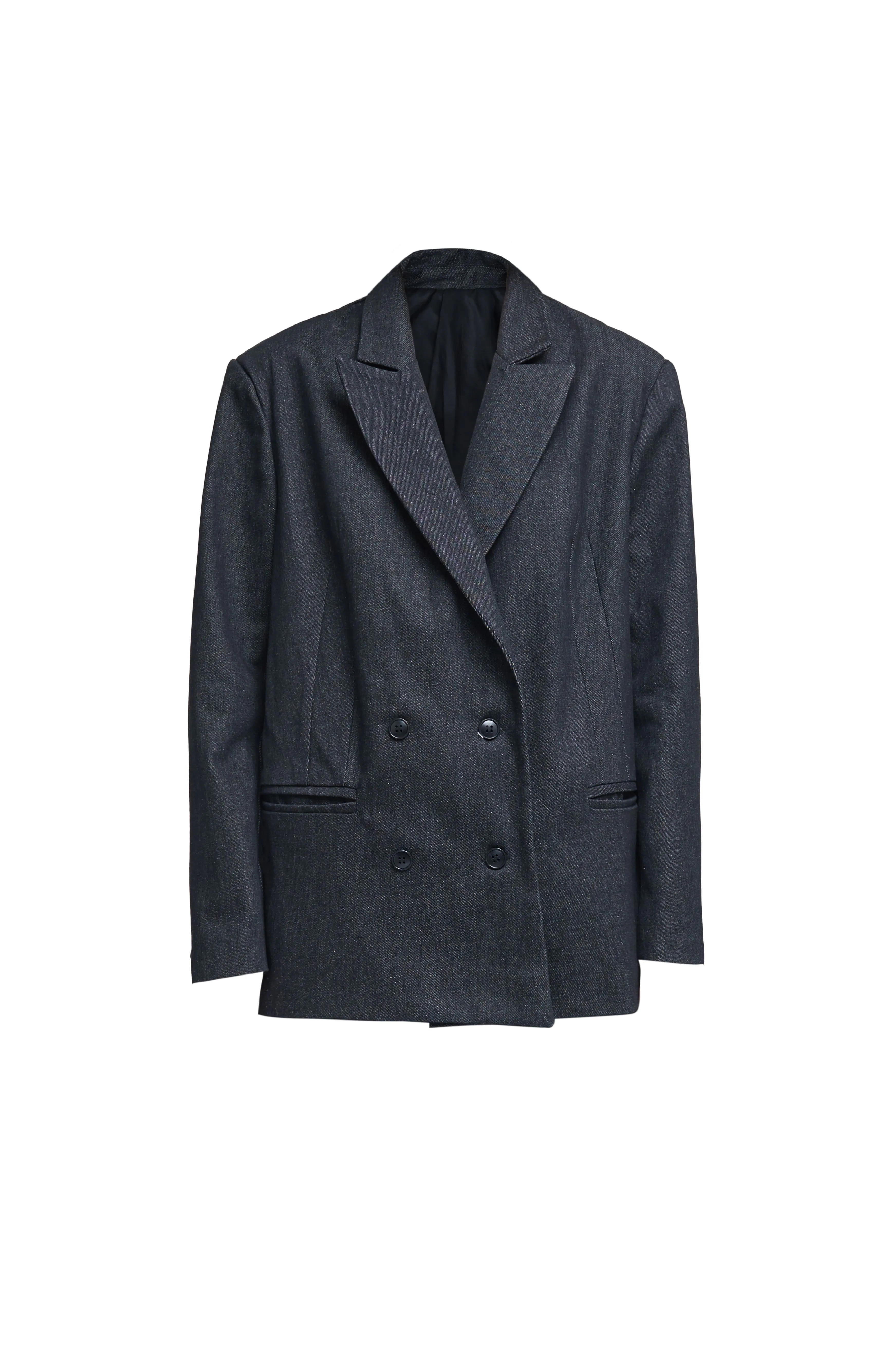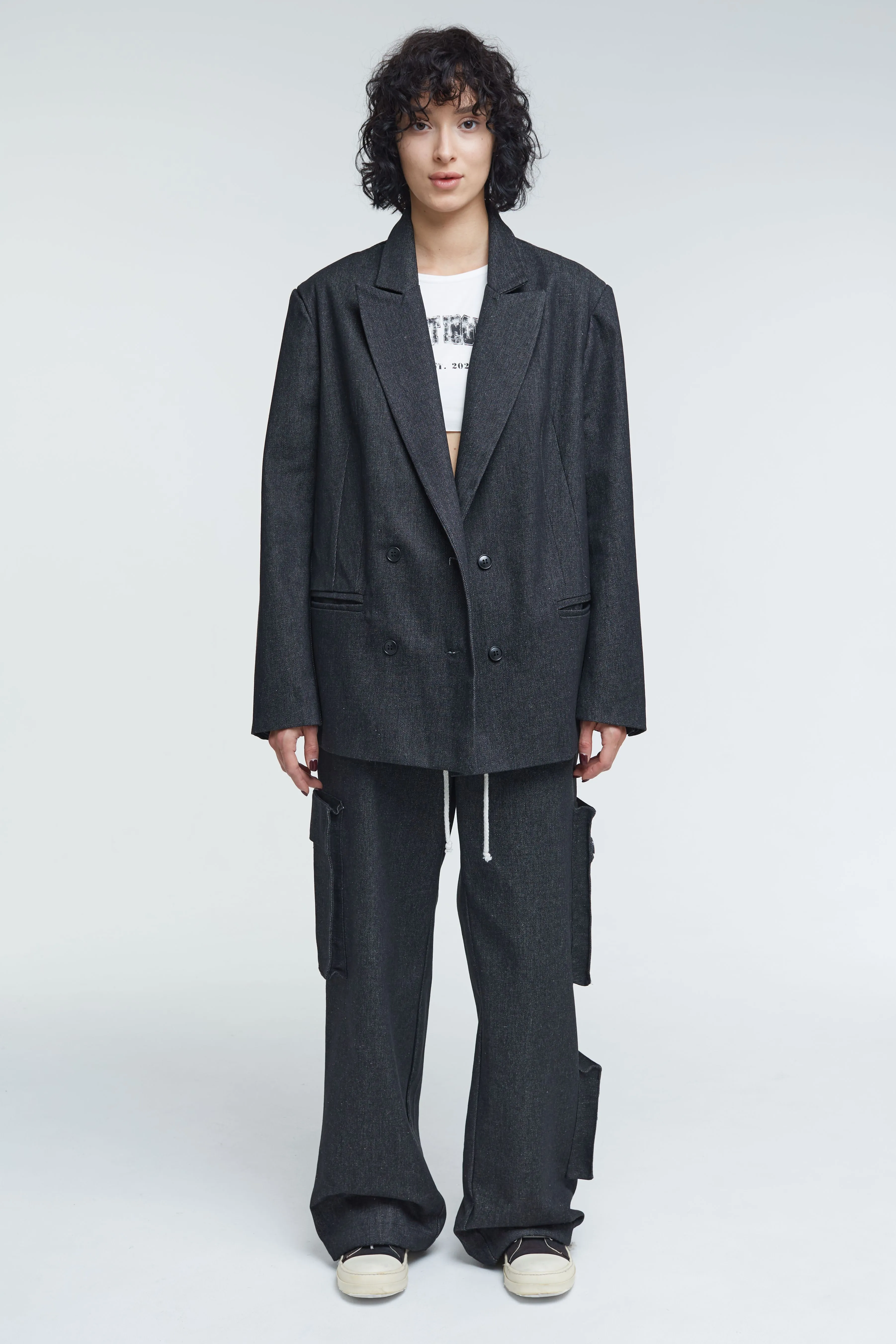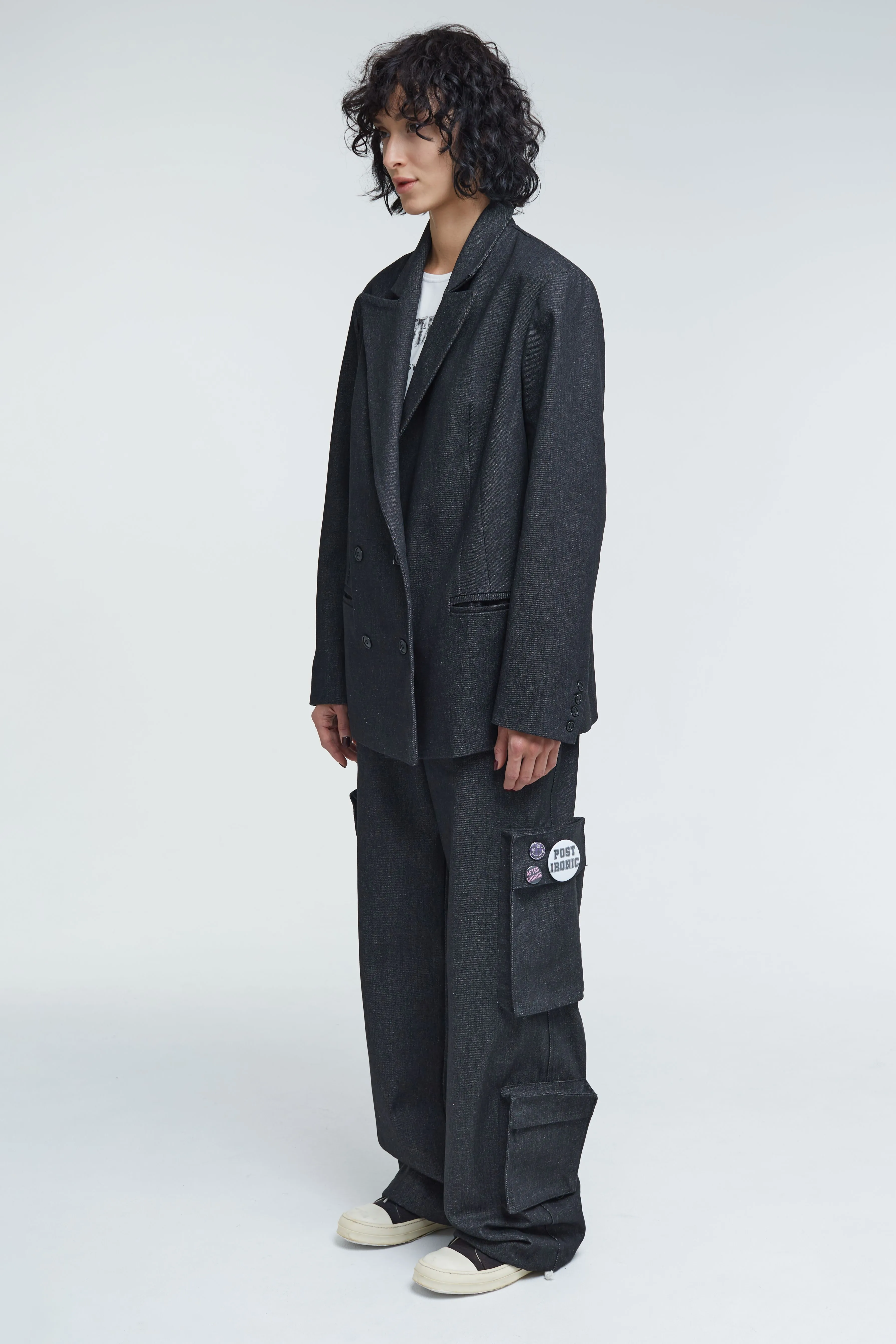 Джинсовый двубортный жакет. Изделие выполнено из плотного темно-серого денима. Крупный принт на спине выводит классическую приталенную модель за рамки формального гардероба.