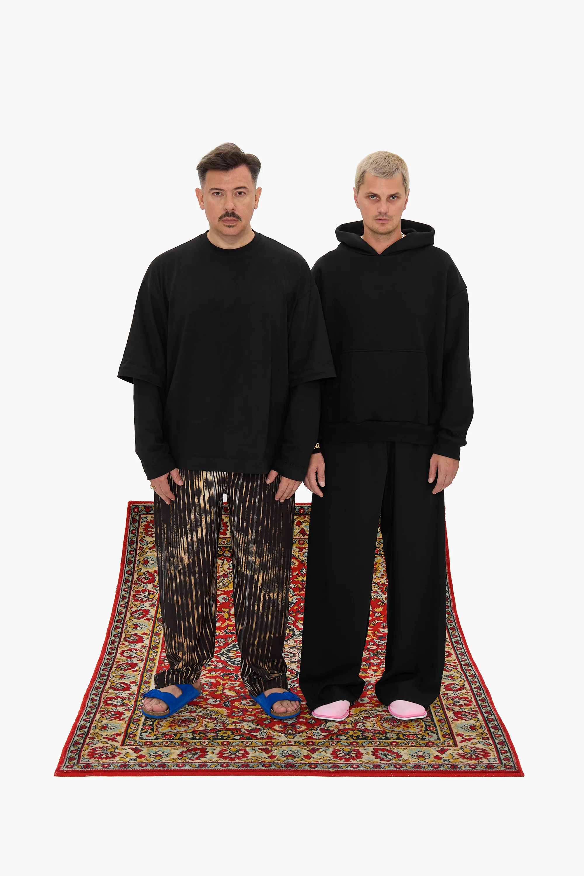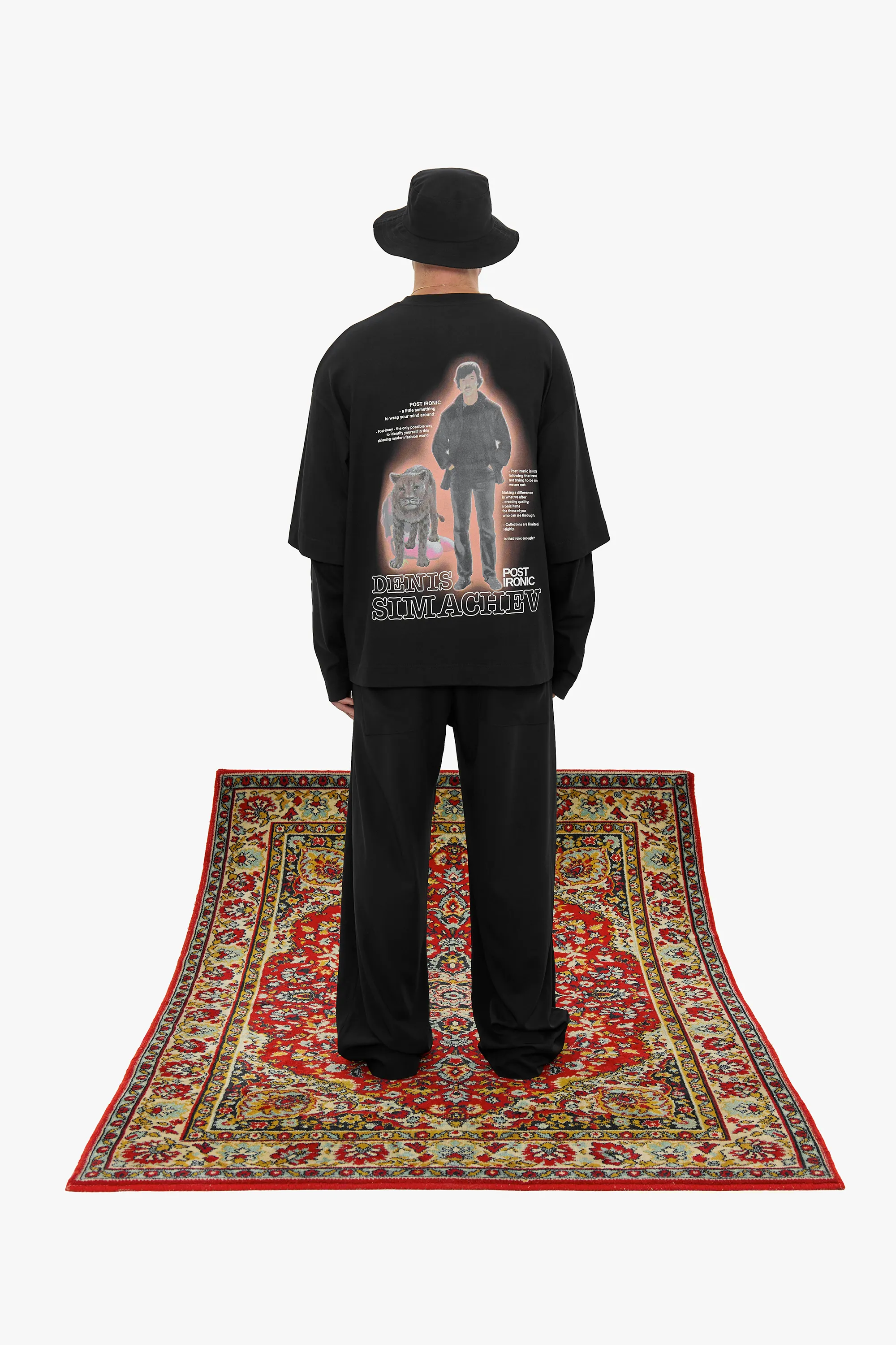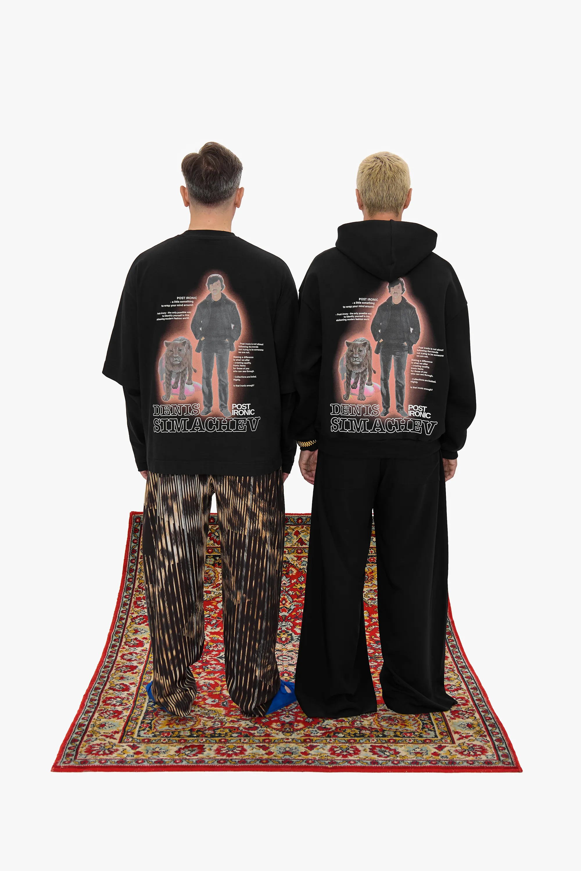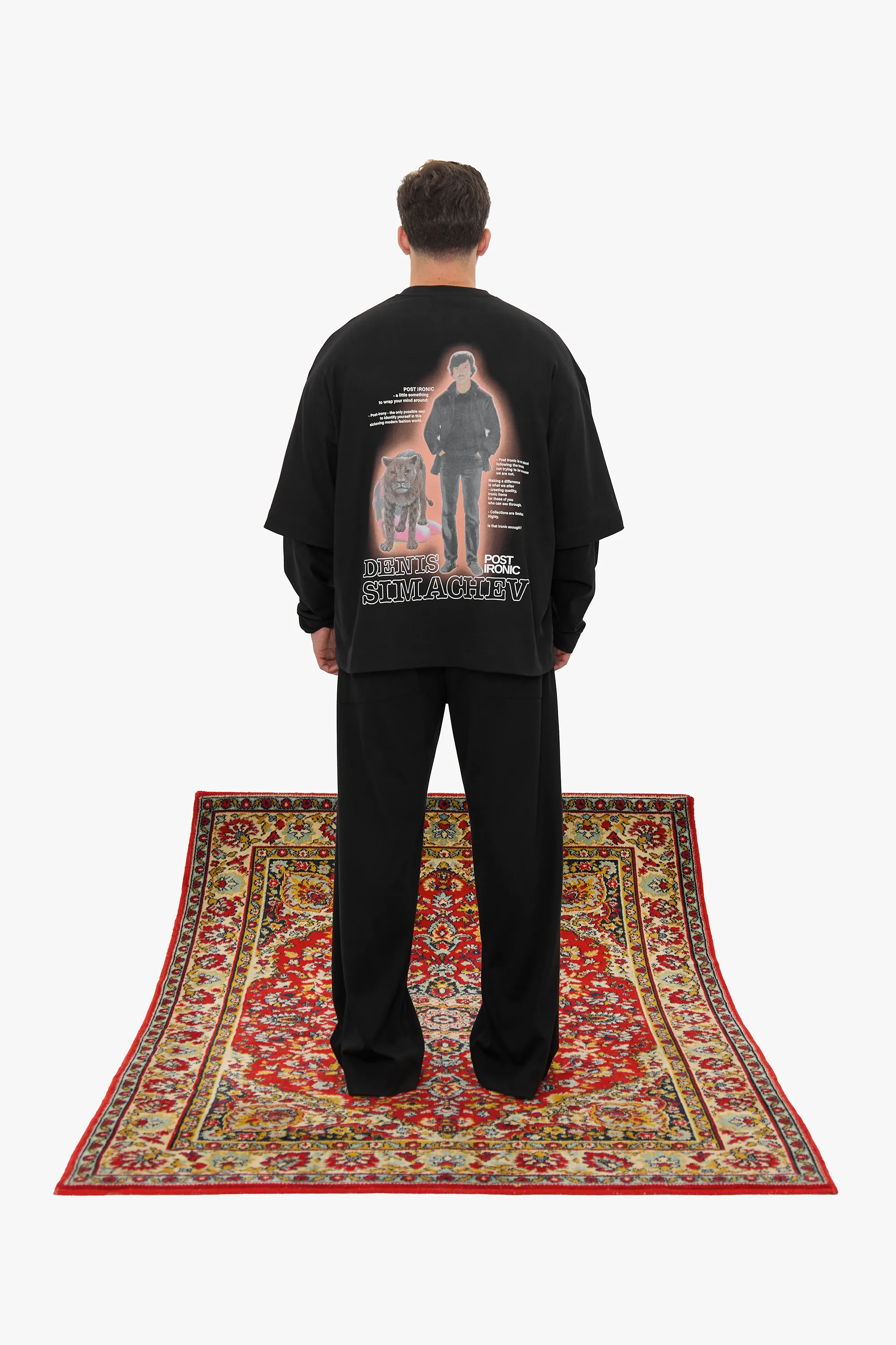 Свободная модель из плотного черного хлопка с крупным принтом на спине. Изделие выглядит как лонгслив, поверх которого надели футболку силуэта oversize. Длинные рукава декорированы вышивкой в тон изделию с логотипами двух брендов.