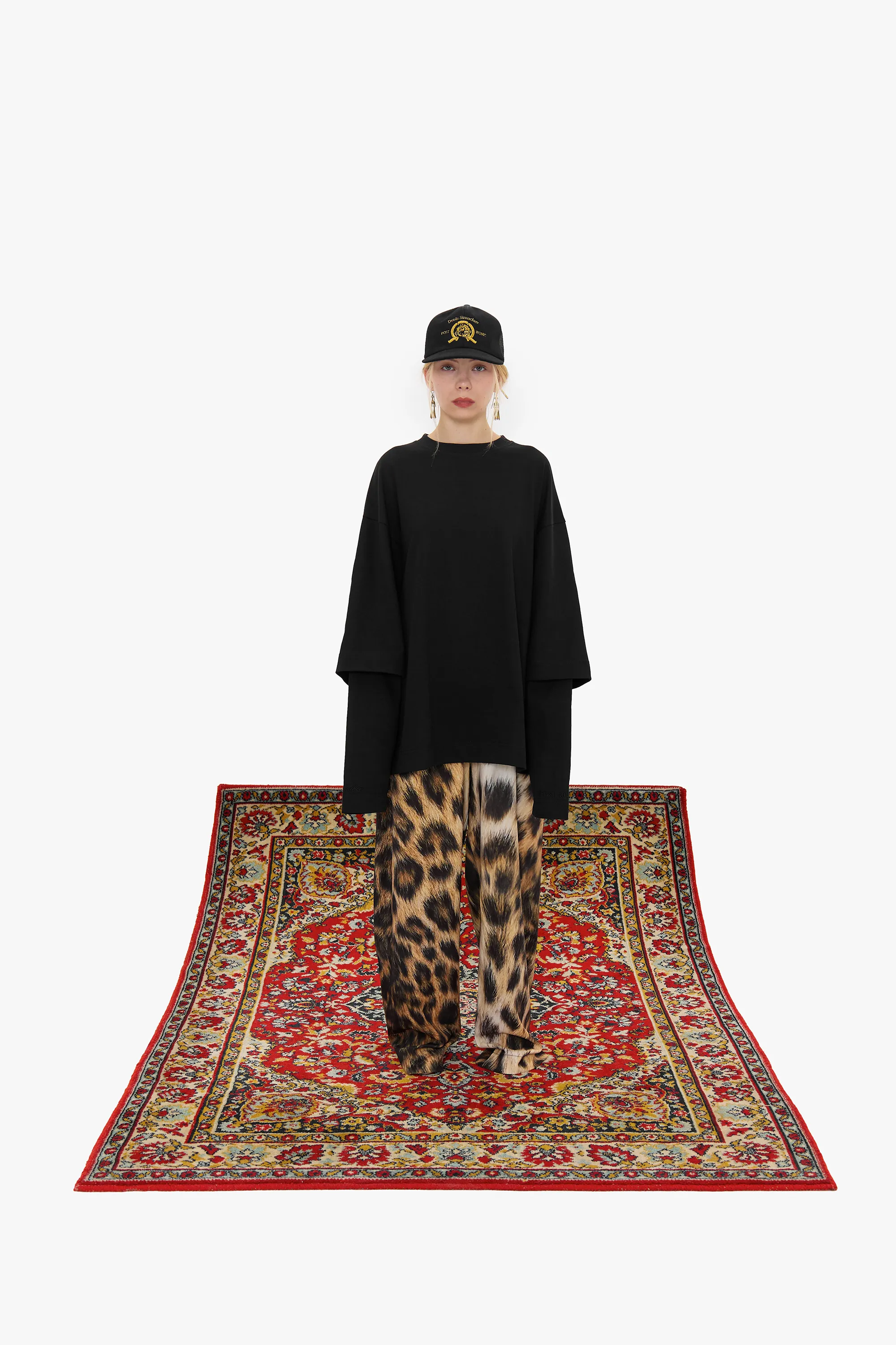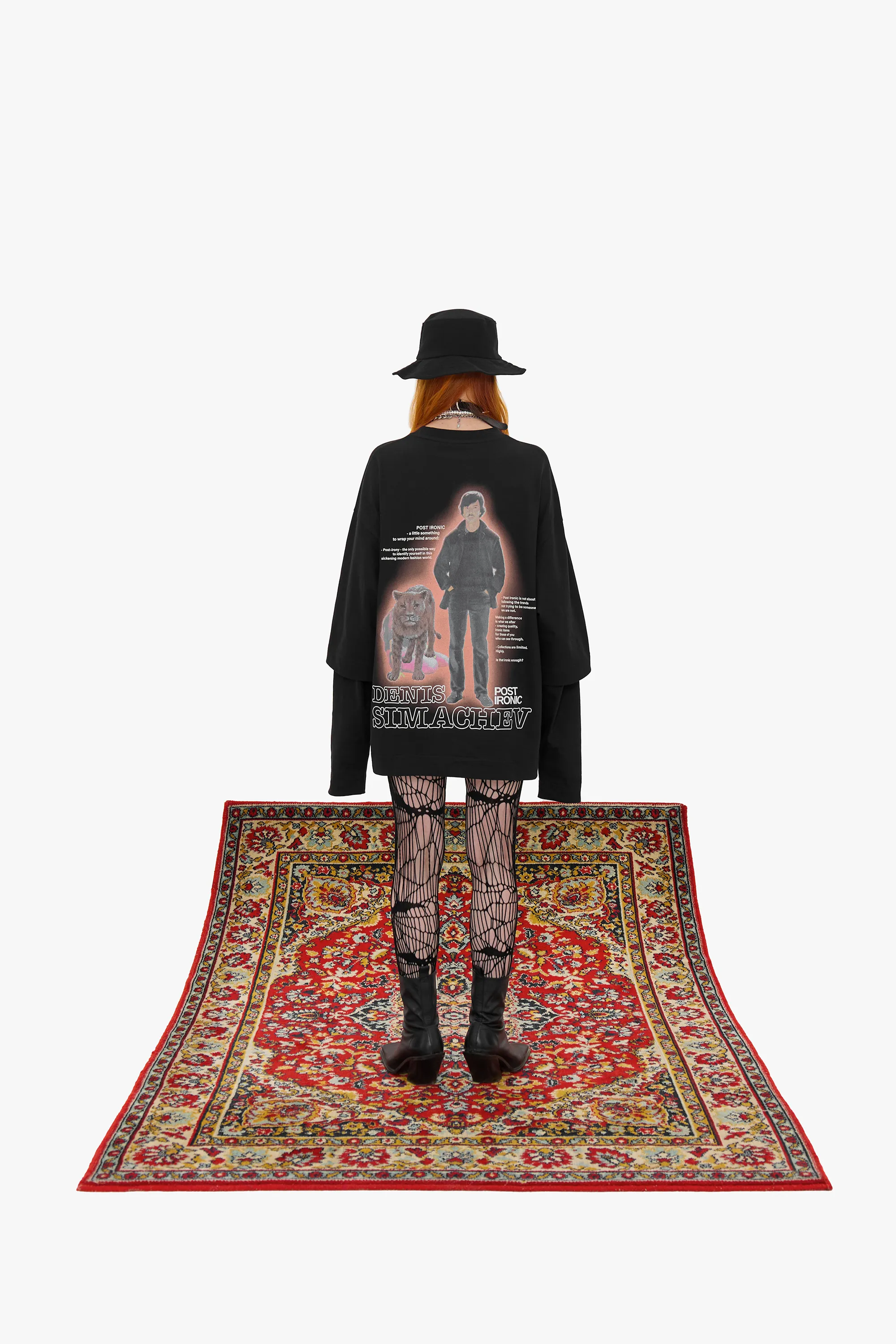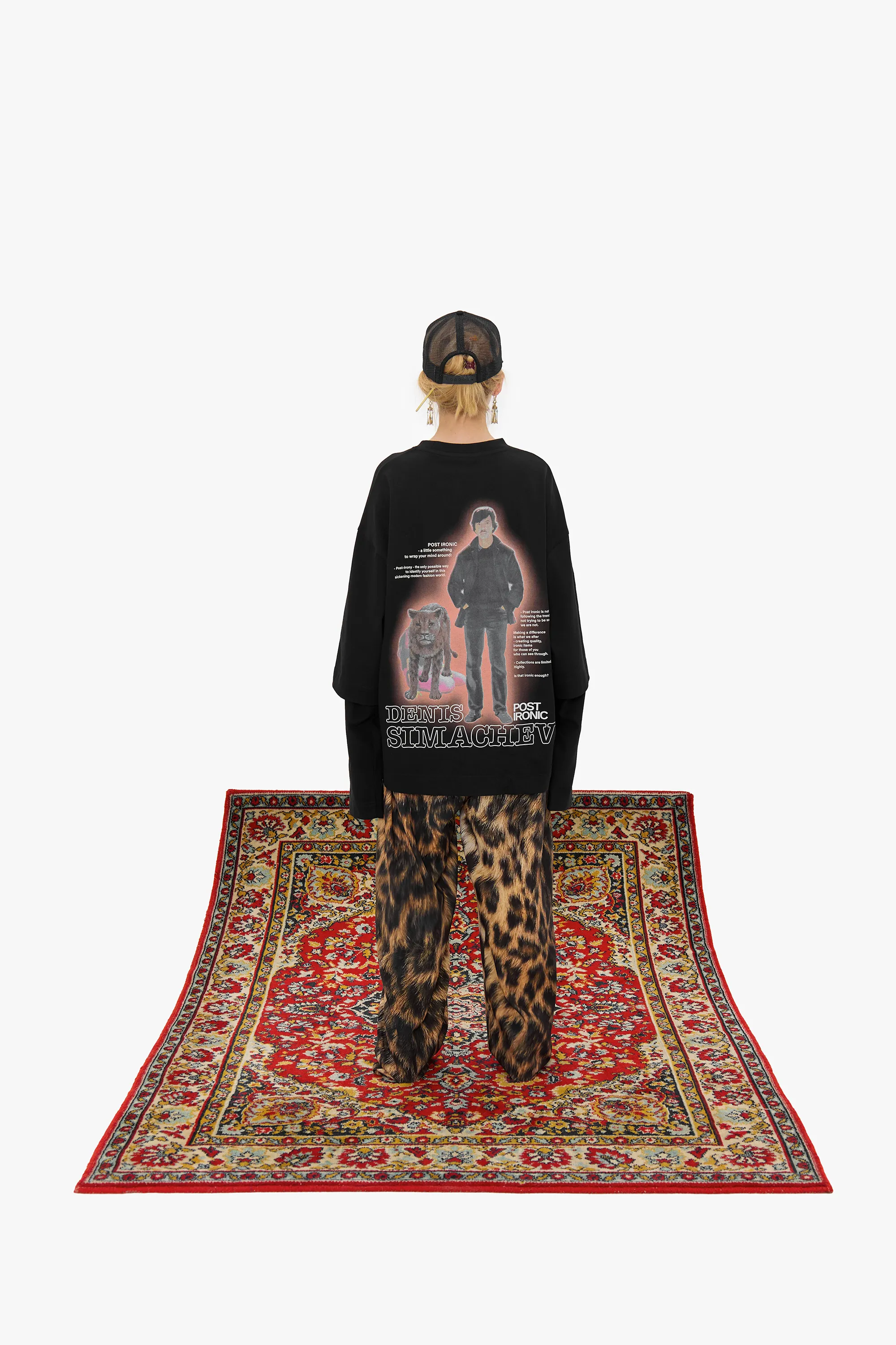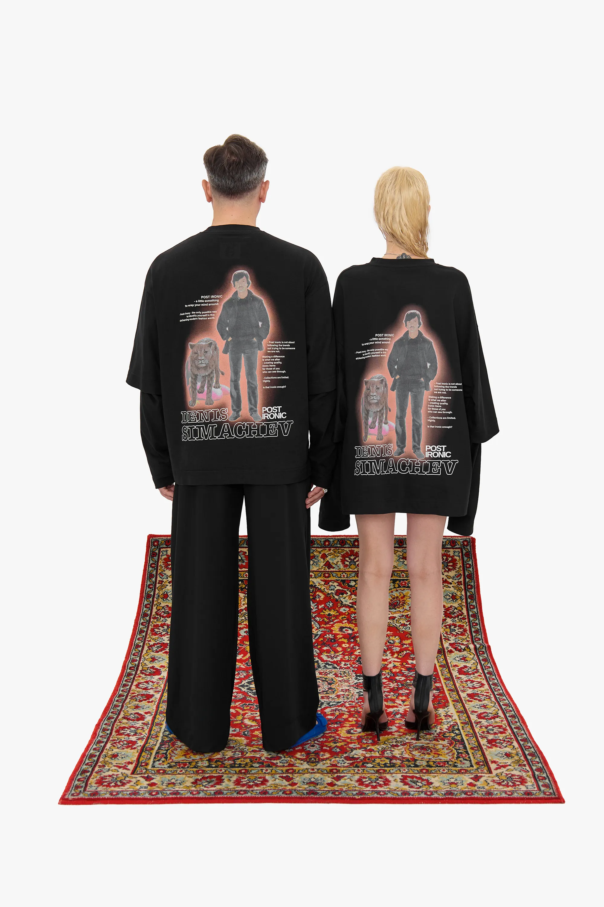Свободная модель из плотного черного хлопка с крупным принтом на спине. Изделие выглядит как лонгслив, поверх которого надели футболку силуэта oversize. Длинные рукава декорированы вышивкой в тон изделию с логотипами двух брендов.