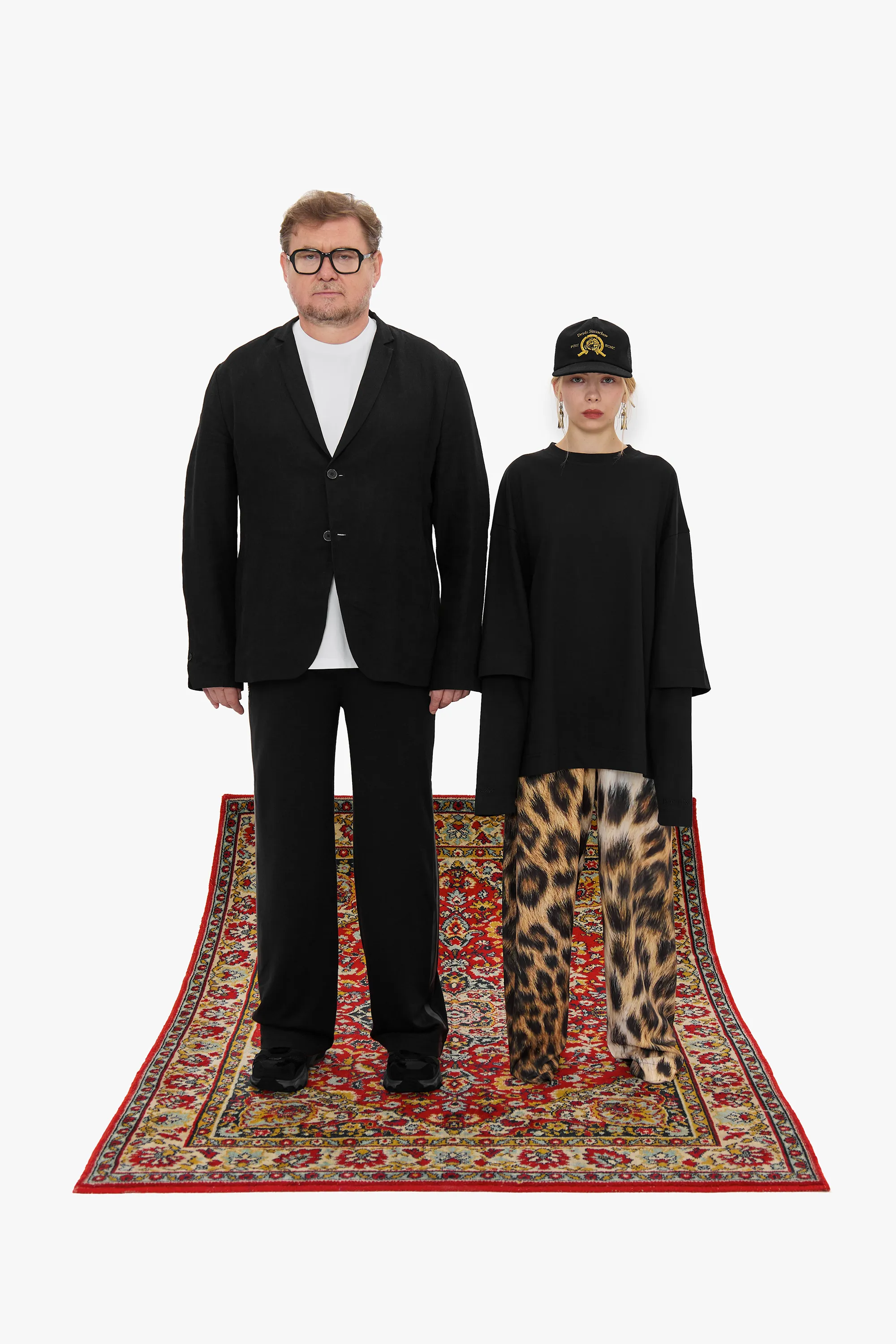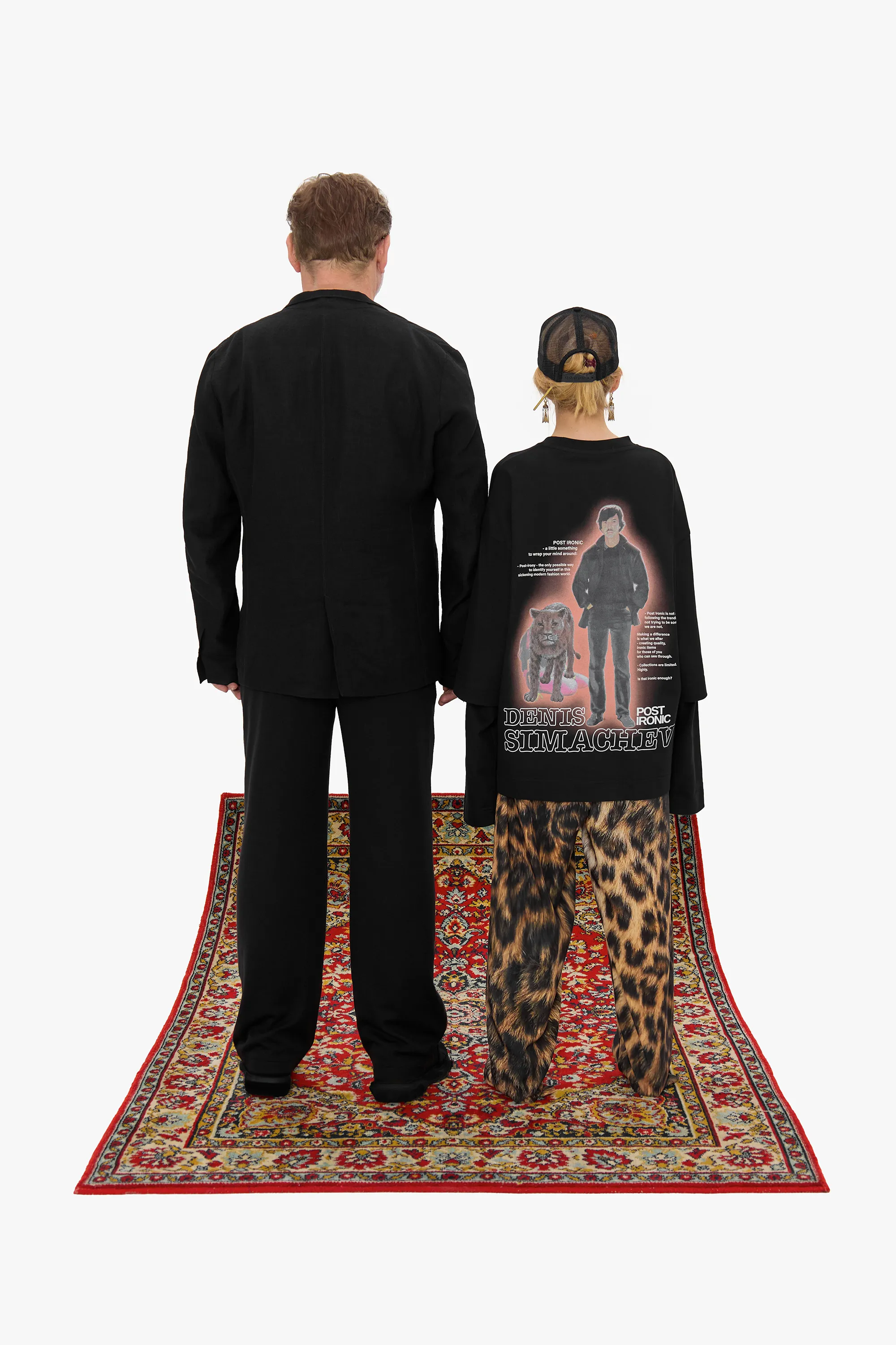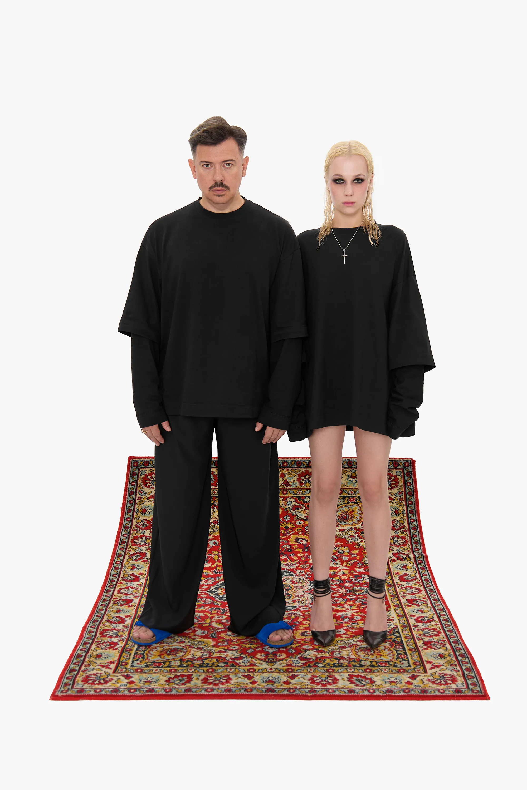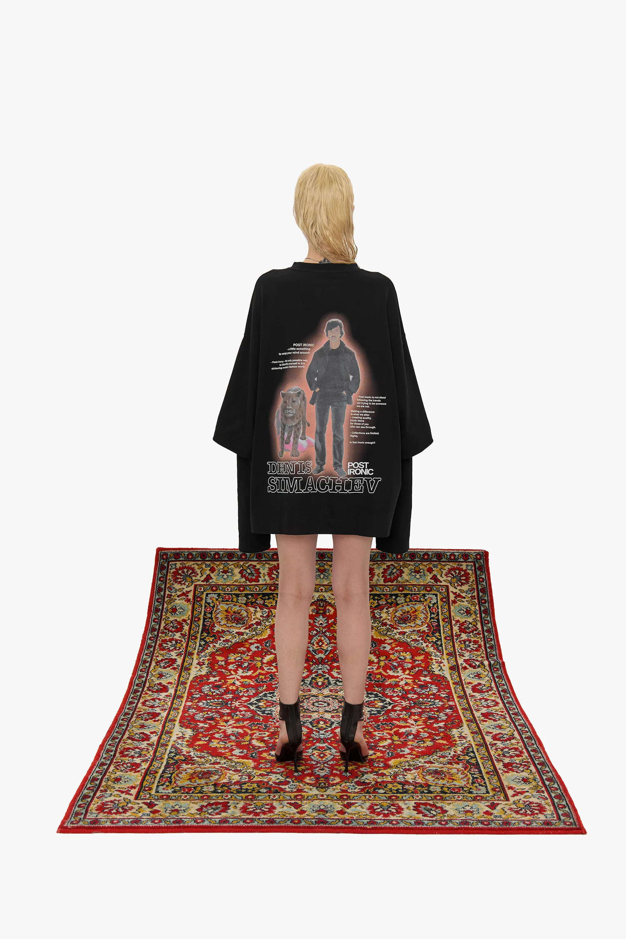 Свободная модель из плотного черного хлопка с крупным принтом на спине. Изделие выглядит как лонгслив, поверх которого надели футболку силуэта oversize. Длинные рукава декорированы вышивкой в тон изделию с логотипами двух брендов.